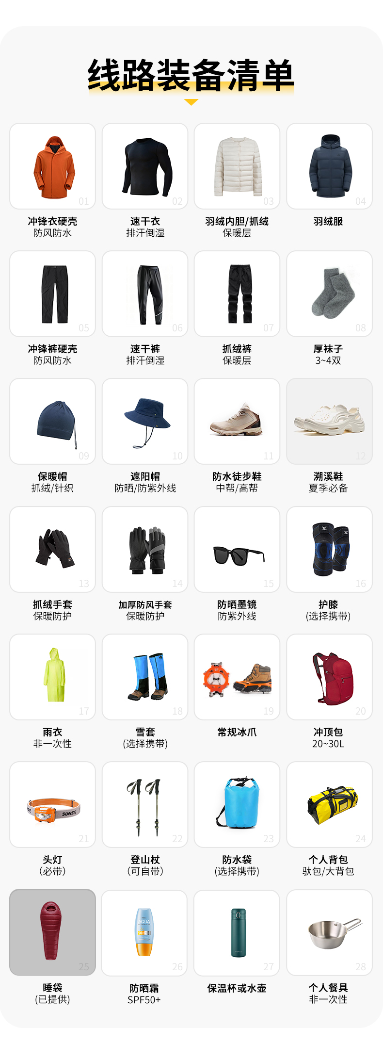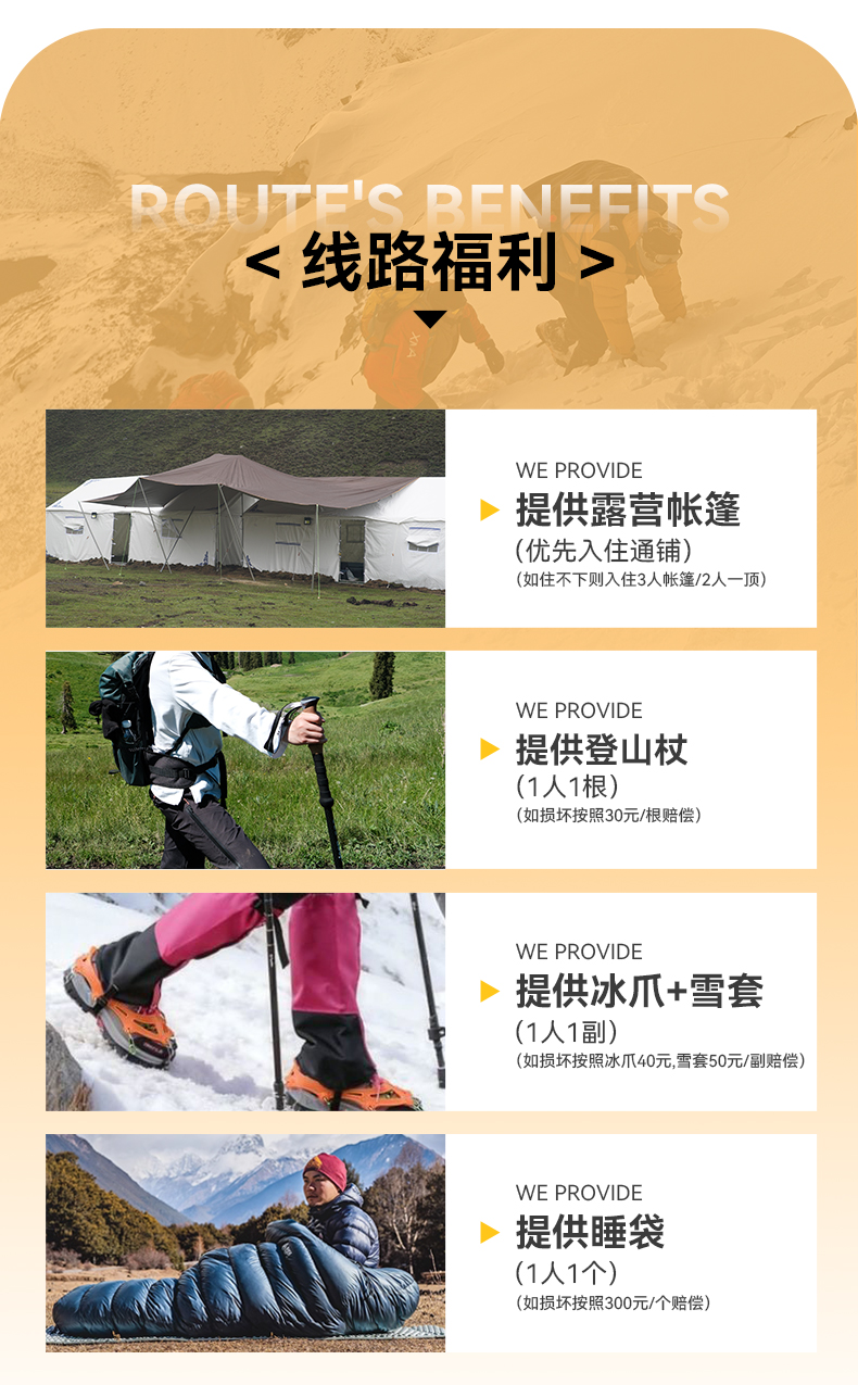 免费提供使用:登山杖1根、冰爪1副、雪套1副。