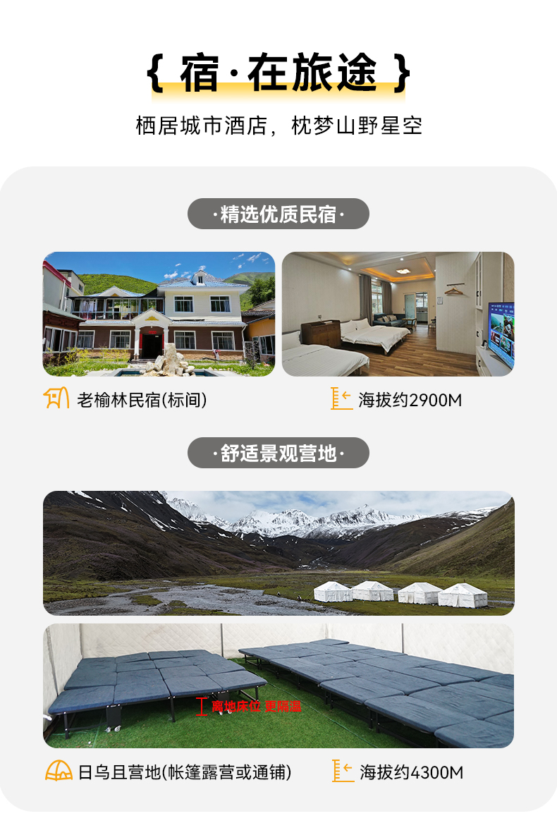 1、住宿:全程2晚住宿(老榆林村1晚、上日乌且大帐篷通铺1晚,含睡袋);