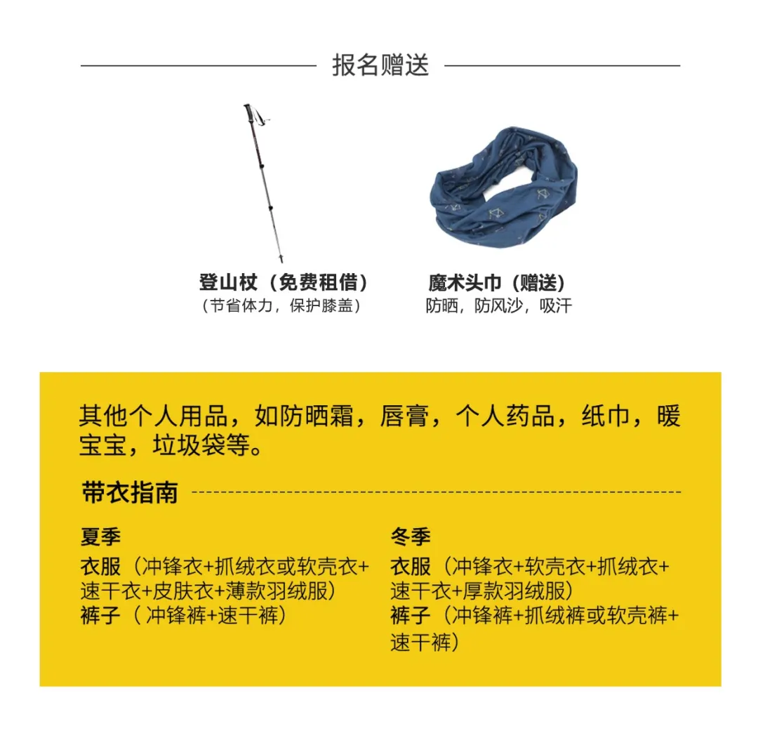 10、赠送说明:本行程免费赠送集合日丽江住宿(部分日期除外,详见费用说明处) 、提供雨衣登山杖证书奖牌各1份,不使用则无费用退还;