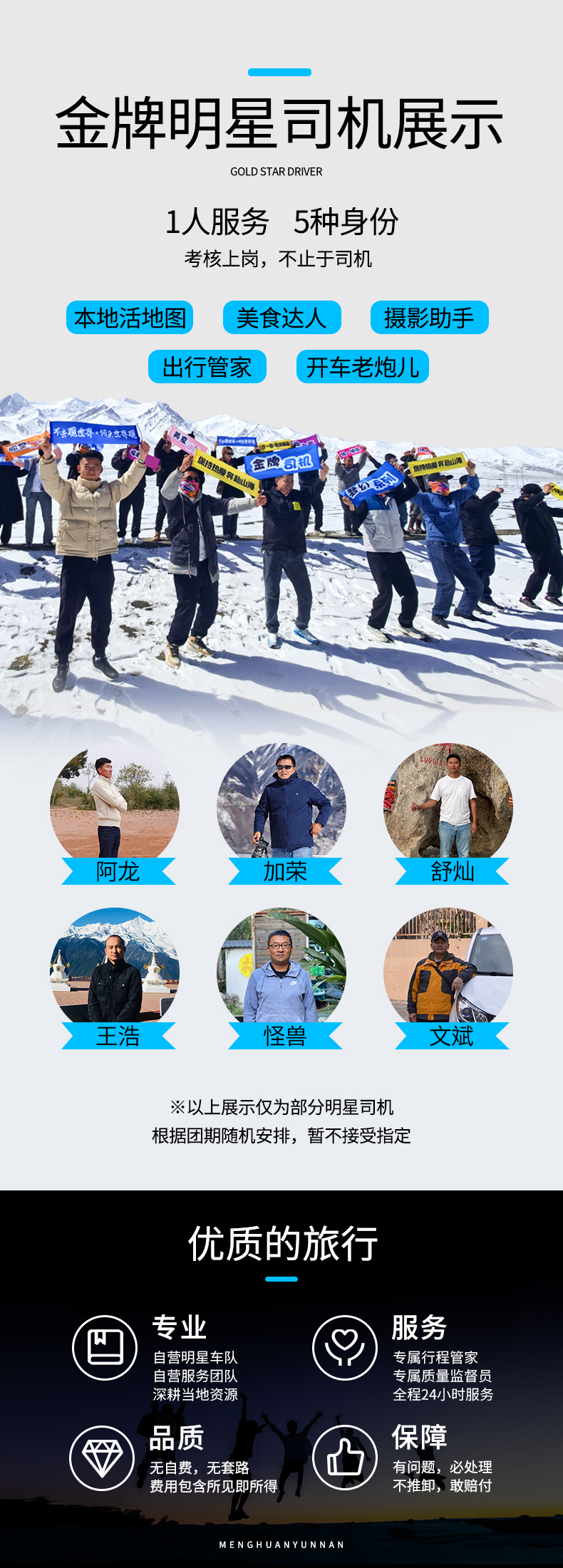 5、司导:司机兼管家,帮助大家购买门票,给团友游玩建议,无法全程陪同进入收费景区和提供专业讲解等服务,敬请谅解;