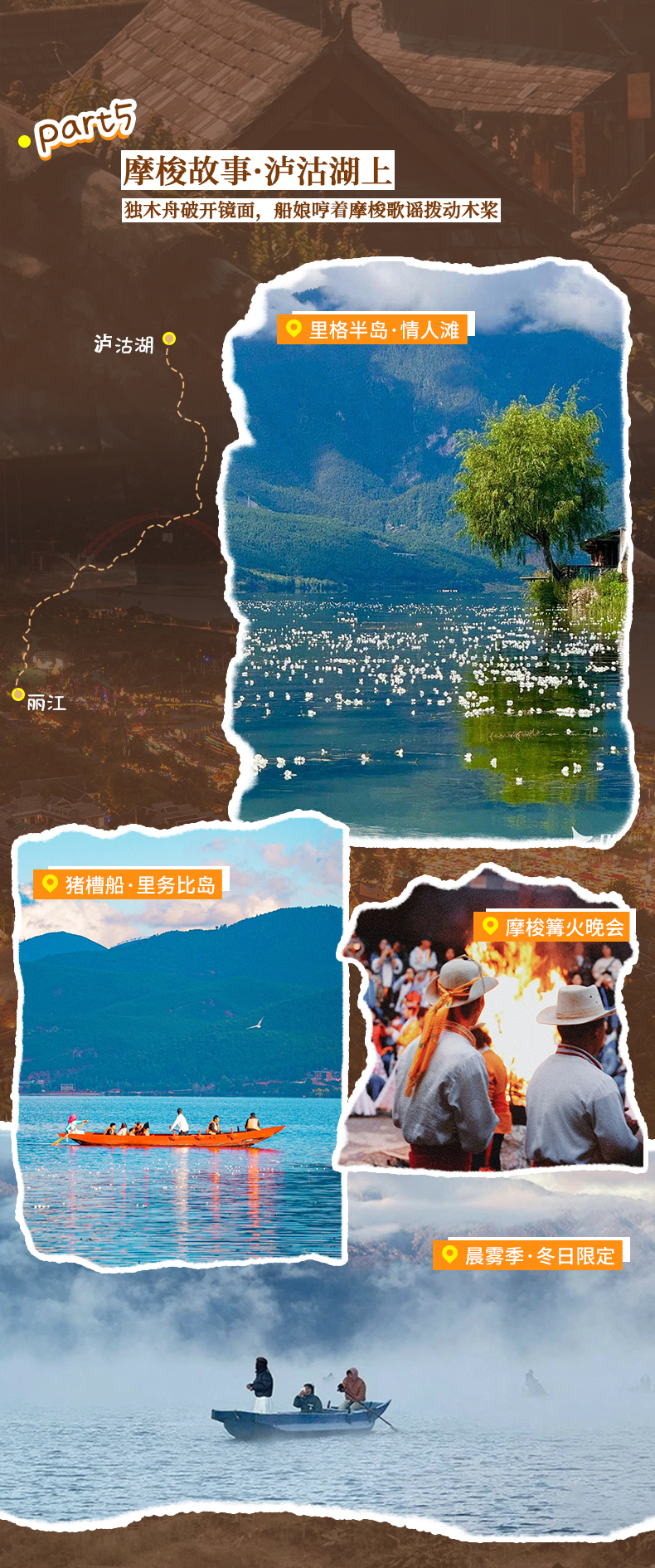 14:00 抵达【里格半岛】,突入湖心的马蹄形半岛将湖水染成孔雀蓝,猪槽船正划破水面驶向里务比岛。建议跳上最鲜艳的那艘小船:当船夫用摩梭语唱起情歌时,把手伸进湖面触碰正在盛开的海菜花——水温永远停留在18℃的温柔。