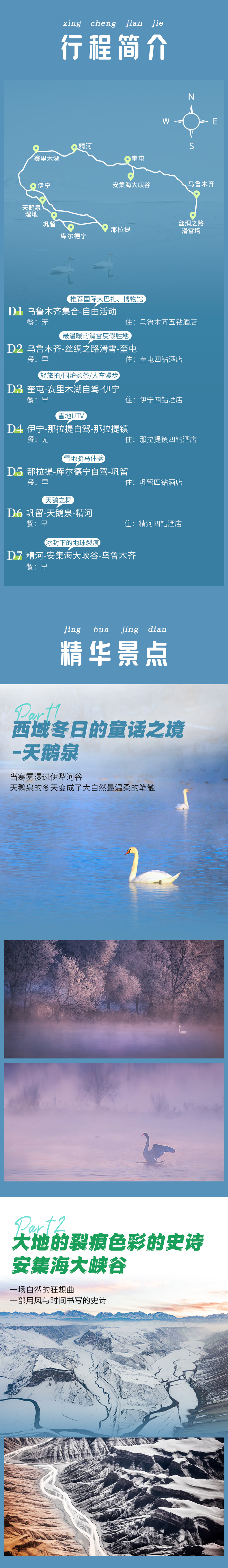 注: 1.我们24小时免费提供接飞机服务,前后会等待30分钟左右,请提前至少2天告知客服所接航班,否则视为自动放弃; 2.接机公司的司机会提前一天的晚上联系您,领队会傍晚联系您,请保持手机畅通; 3.11月下旬到次年2月末为最冷季节,气温普遍零下10度-零下20度。一定要准备好保暖的衣物。日出时间为9点30,日落时间为18点30左右,大家掌握好游玩时间。 4.新疆地处中国最西部,日出日落时间均比我国东部晚约2小时,新疆人一般在中午2点吃午餐,晚上8、9点才吃晚饭。