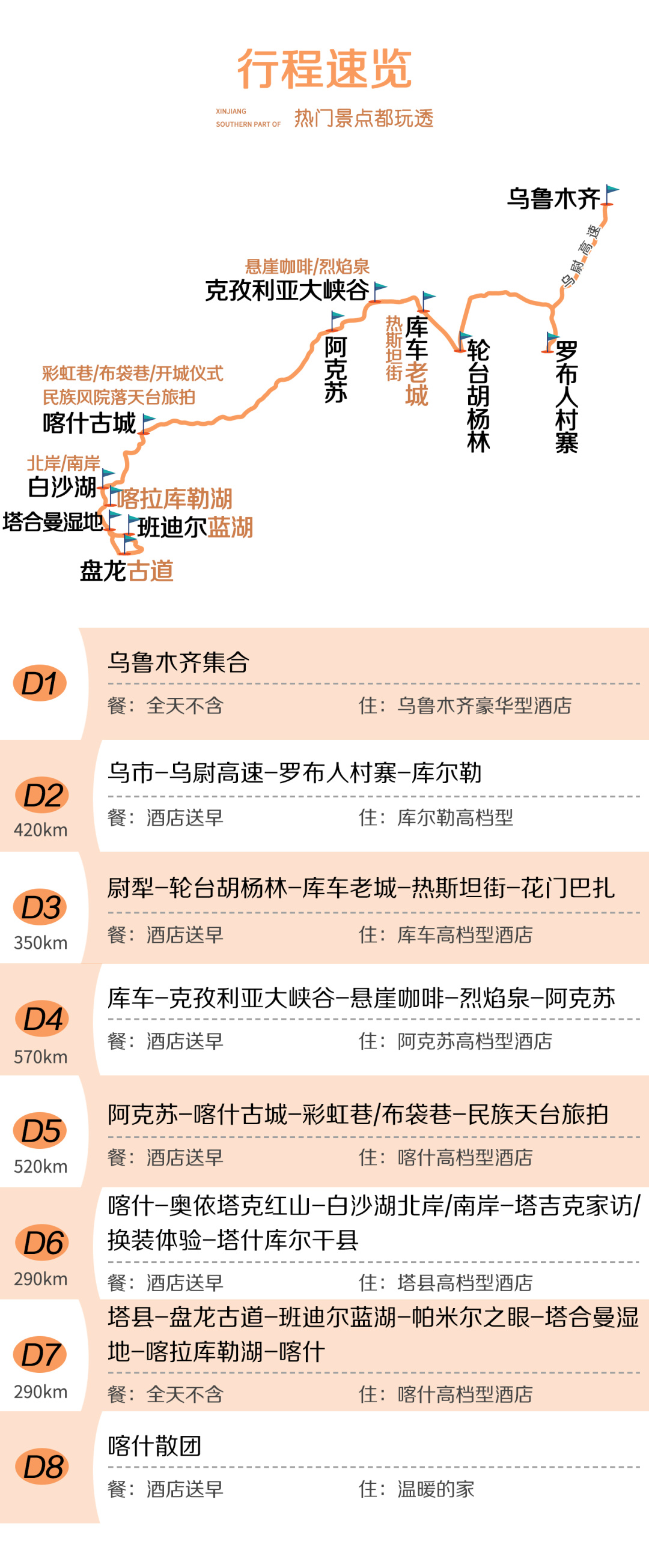 2. 门票:全程景点首道大门票+区间车:罗布人村寨门票、轮台胡杨林门票、克孜利亚大峡谷自驾票、白沙湖门票、喀拉库勒湖门票;