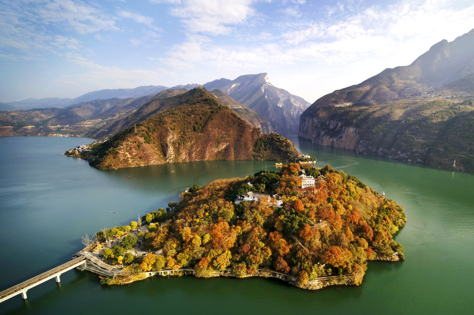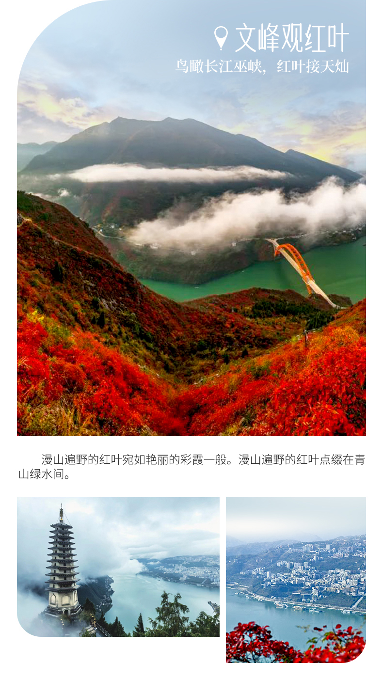 站在文峰观山顶远眺,红叶遍山峦,长江如带、柔润绵长,一江碧水与江山红叶交相辉映,蔚为壮观。透过似火的红叶,俯瞰巫峡口彩虹卧波,“一桥飞架南北,天堑变通途”。远眺巫山县城依山层叠,江与城风情如画,让人顿生江山豪情。