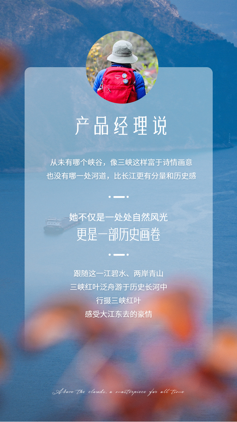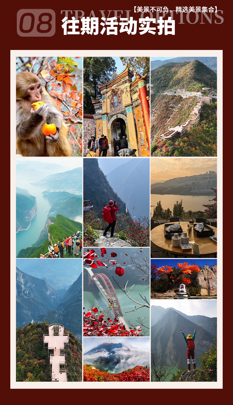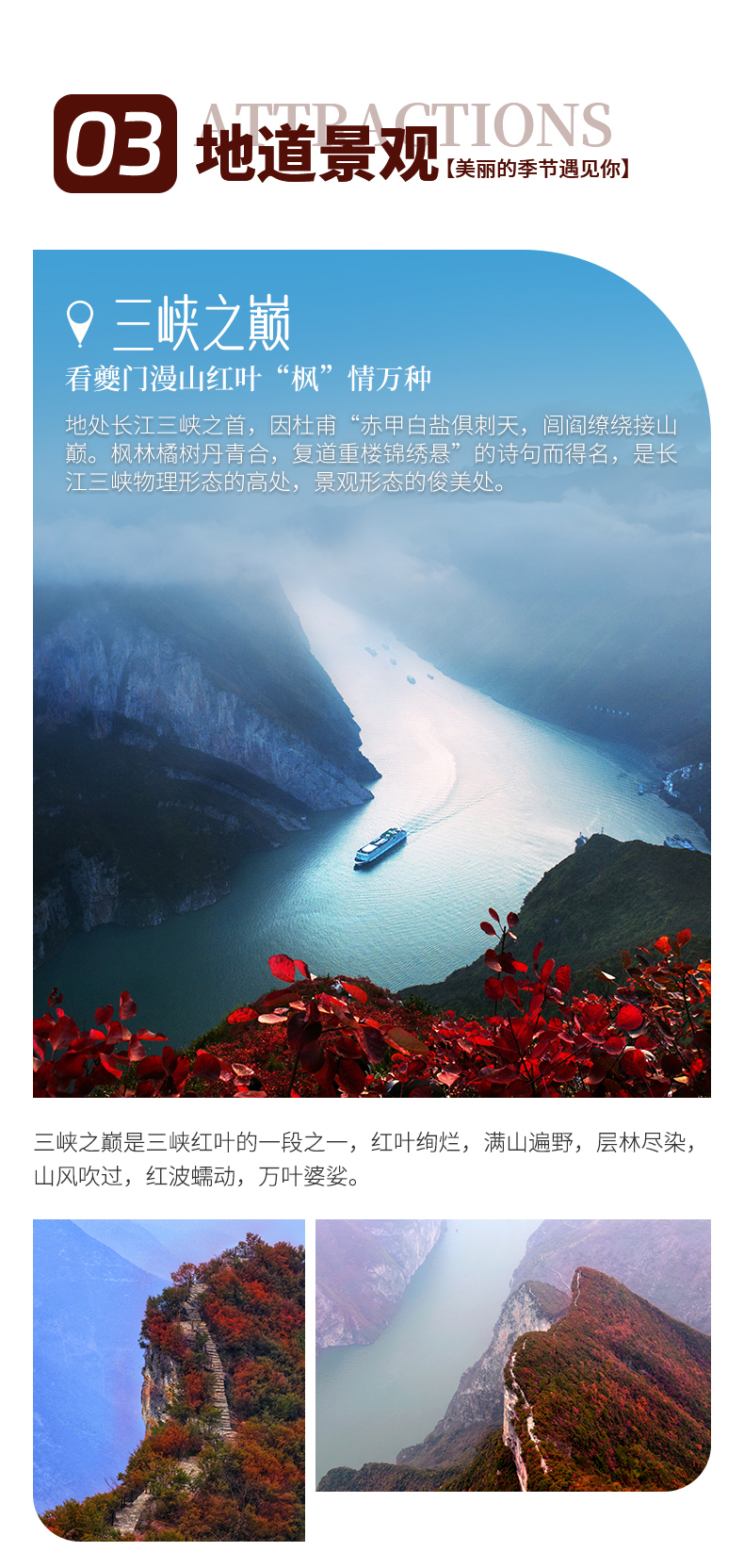 D3:巫山—三峡之巅—白帝城—巫山全天 早上,前往【三峡之巅】(40分钟车程) 三峡之巅,地处长江三峡之首,因杜甫“赤甲白盐俱刺天,闾阎缭绕接山巅。枫林橘树丹青合,复道重楼锦绣悬”的诗句而得名,是长江三峡物理形态的最高处,景观形态的最美处。站在三峡之巅俯瞰长江的壮美和那满山的红叶。时间碰巧的话,在三峡之巅还有个人的音律表演。 中午,在白帝城周边用午餐(自理) 下午,驱车前往【白帝城·瞿塘峡】以“朝辞白帝彩云间,千里江陵一日还”的诗句而闻名于世的白帝城,位于重庆市奉节县城城东十里的白帝山上。我们将深入山间小路,拍摄瞿塘峡风光,如果你还能找到一张第五版10元人民币,别忘记带上,看看【夔门】过去和现在的变化,三峡大坝蓄水至海拔175米后,瞿塘峡已是高峡平湖,两岸险峰峻石依旧,既有满山红叶似彩霞的绚丽多姿,又有碧水荡漾、烟波浩渺的静美壮阔。