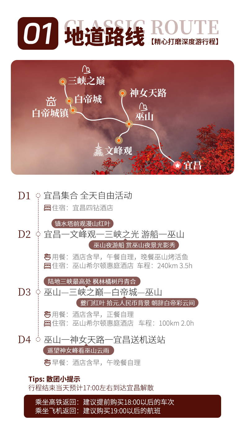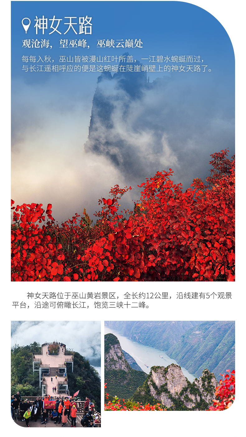 D4:巫山—神女天路—宜昌解散全天 早上,前往【神女天路】(车程约40分) 神女天路全长12公里,平均海拔1200多米,而公路盘旋于悬崖峭壁之间,车辆时常穿行于雾霭之中,如同在天上行走,因而命名神女天路。 沿途分布有5个观景平台(即:天盏灯、仙履台、瑶台、山神庙、飞云台)。一路风景绝佳,山清水秀。在这里沿途可俯瞰长江、隔江对望神女峰、神女庙、赏峡江烟云、寻巫峡神龟、惊长江倒流,更是可以看万山红遍,层林尽染,将重峦叠嶂中的巫山红叶尽收眼底。 中午,在巫山用中餐(自理)餐后返回宜昌,预计17:00到达,车程约3小时,全程高速。