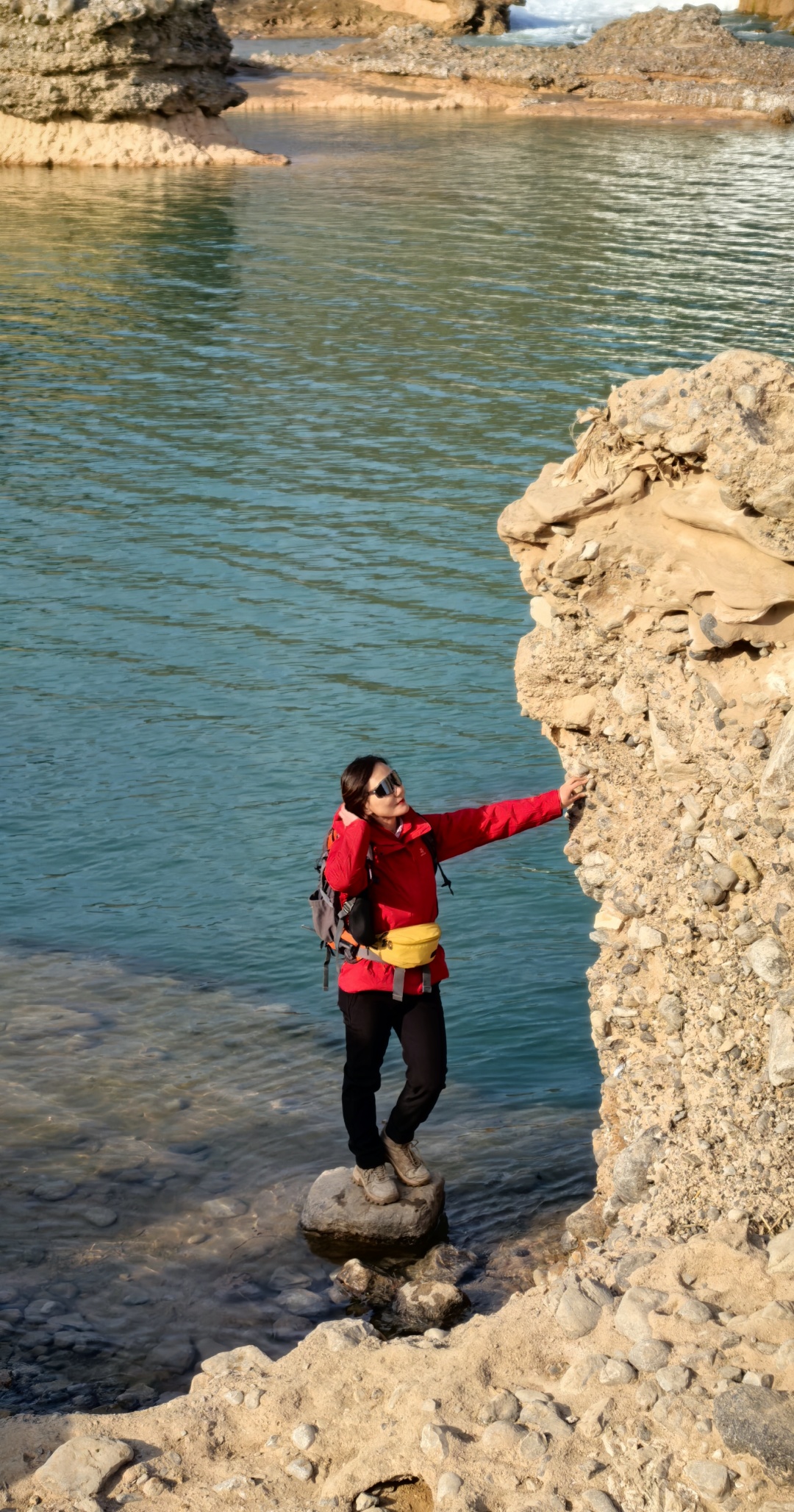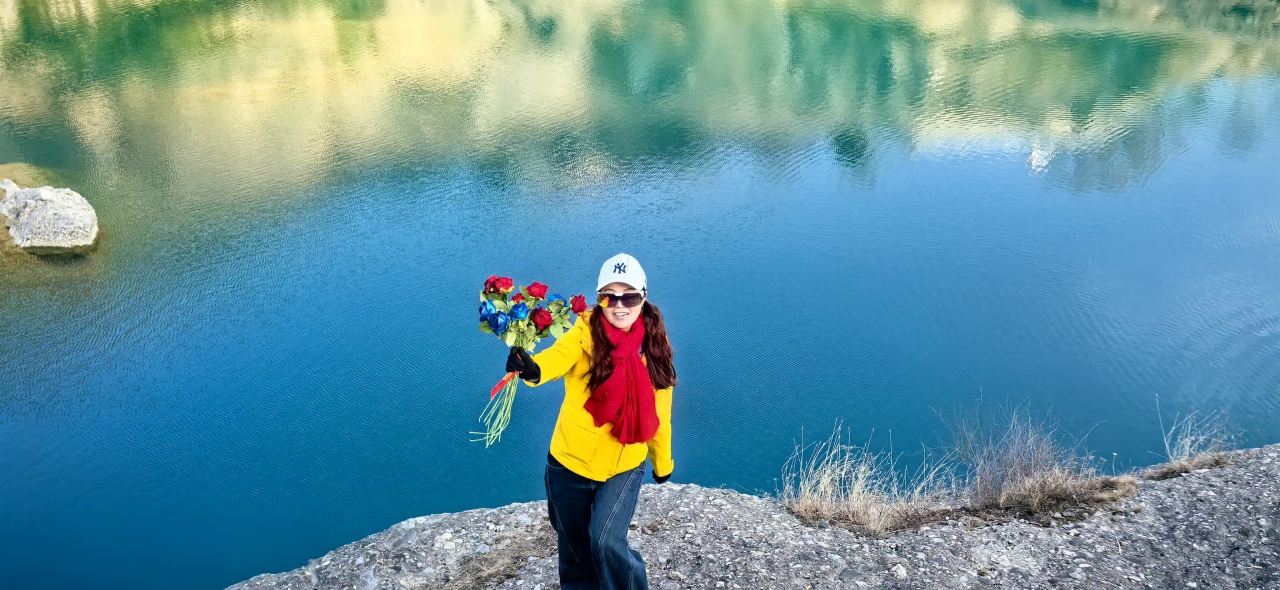 碧绿色的水潭镶嵌于天然峡谷之中,峭壁乱石与如镜水面相互映衬,蓝绿色的潭水与嶙峋岩壁相映成趣。河谷内散落着被河水冲刷得形态各异的石头,堆叠起来的石堆极具氛围感,搭配蓝绿色水面,像极了迷你版水上雅丹。