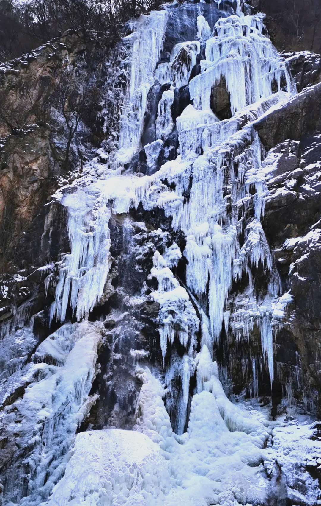 因九座山形似盛开的莲花而得名,瀑布高 80 米,从空中飞泻而下,十分壮观,冬季会形成晶莹剔透的冰瀑。