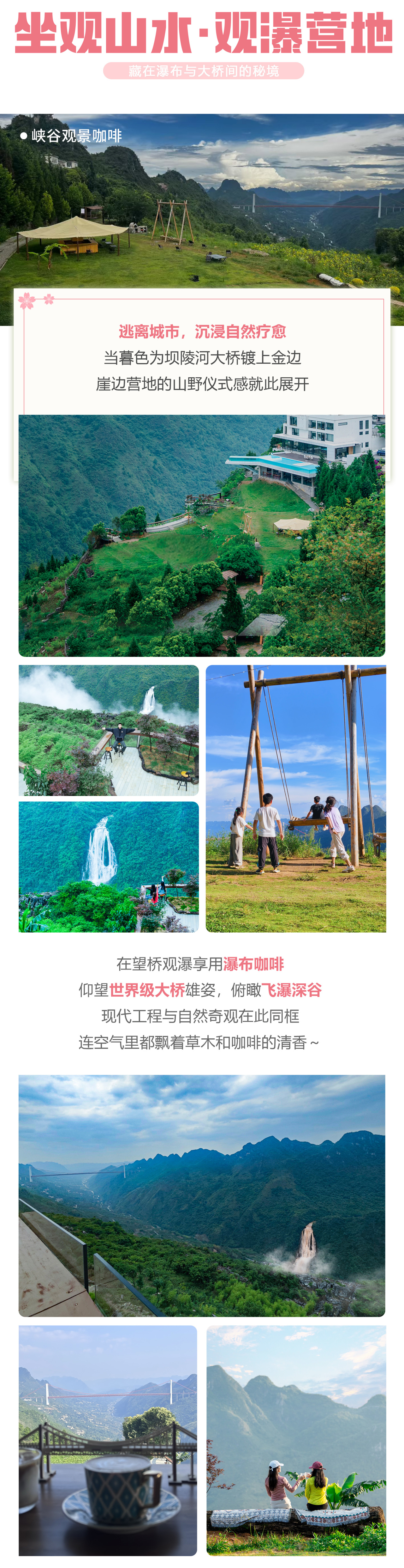 下午我们前往贵州悬崖上的神仙秘境,承包瀑布与夕阳的望桥观瀑营地,在悬崖边享用观瀑咖啡,看世界级大桥与滴水滩瀑布同框,享受片刻宁静,呼吸新鲜空间感受大自然的温度。