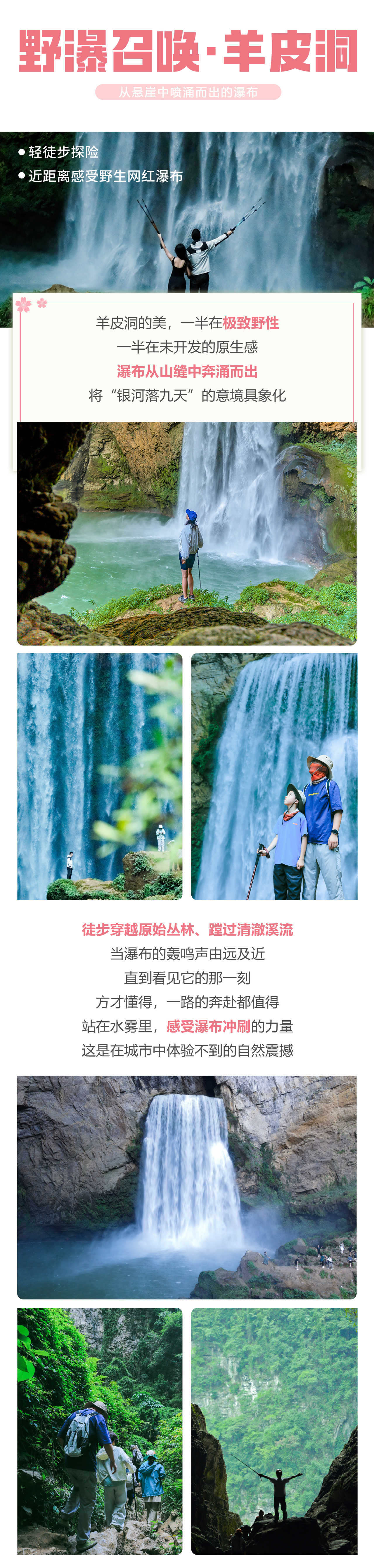 D2:贵阳-羊皮洞全天 酒店自助早餐后集合出发,前往羊皮洞,抵达后观赏【羊皮洞瀑布】,这是一座41米高的天然洞中瀑布,由地下暗河冲击岩壁而成,洞口形似羊皮,被誉为“贵州小冰岛”。站在瀑布前水雾弥漫区,可感受“飞流直下”的震撼,你可在水雾弥漫中尽情创作大片,徒步结束后乘车前往惠水。