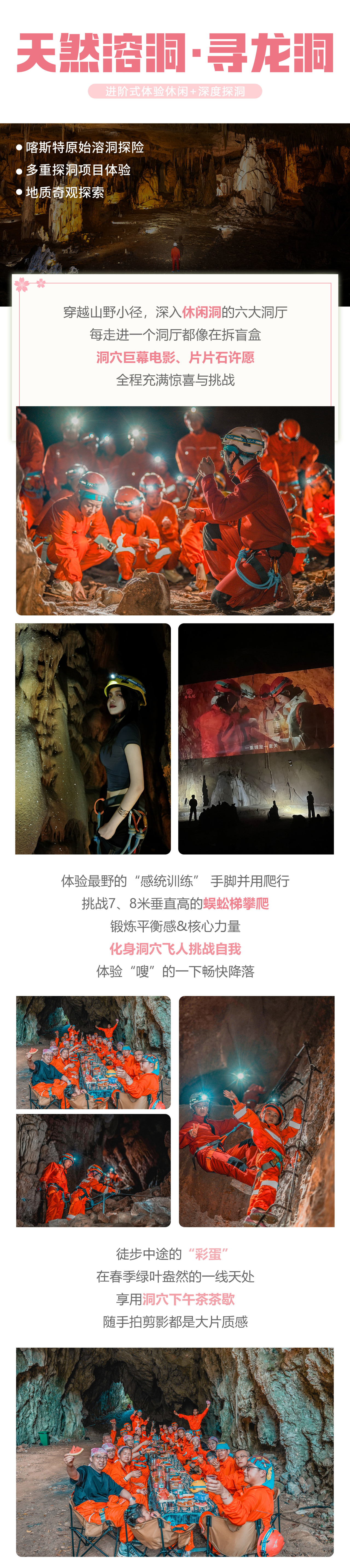 D5:安顺-寻龙洞探洞-贵阳送站全天 早餐后集合出发,乘车前往【寻龙洞】,寻龙洞位于安顺龙宫核心景区旁,以喀斯特地质奇观与户外运动体验为特色,新手友好,全年龄段适配。 抵达后领取景区提供的探洞装备(探洞服、头盔、安全绳),在专业教练指导下开启探洞之旅,全程约4小时,徒步里程约5公里,含岩壁攀梯、高空绳降等项目(无需专业基础,教练全程陪同)。 最后一天,我们短暂而美好的行程在这里画上句号,希望这次旅行给大家带来的不仅有视觉的冲击,更有心灵的归属。