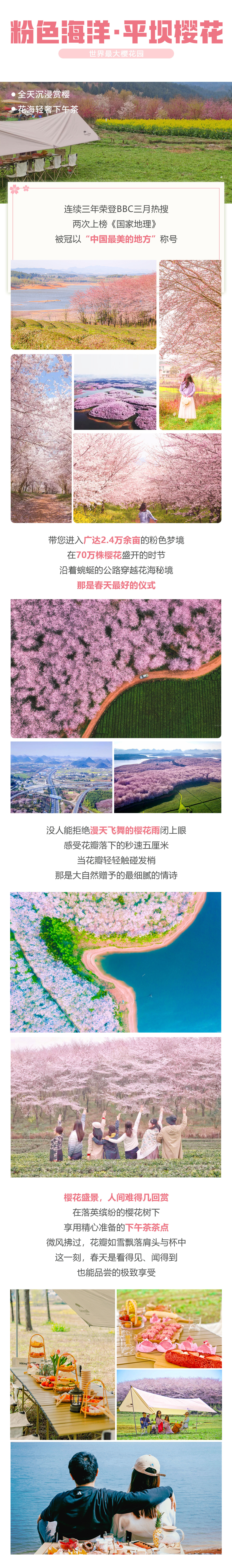 D3:安顺-平坝樱花园全天 【平坝樱花园】是目前中国集中连片种植面积最大的樱花基地,共有樱花70多万株。樱花园里的樱花以早樱和晚樱两种为主,早樱占了绝大部分,为粉白色,在每年的三月上旬开花,一直持续到月底。 盛花期,早樱花朵烂漫,花香四溢,远远望去,如云似霞,极为壮观;晚樱为桃红色,我们进入花海,在樱花树下体验【樱花主题下午茶】,享受樱花落下的秒速五厘米的浪漫,在这里你可以尽情拍照享受花海贵州。