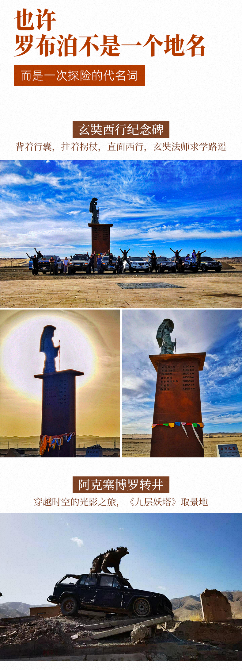 罗布泊无人区+大海道无人区+阿尔金山无人区+库木塔格沙漠+小泉沟大峡谷+博罗转井小镇+彭加木失踪纪念地+安南坝野骆驼保护区