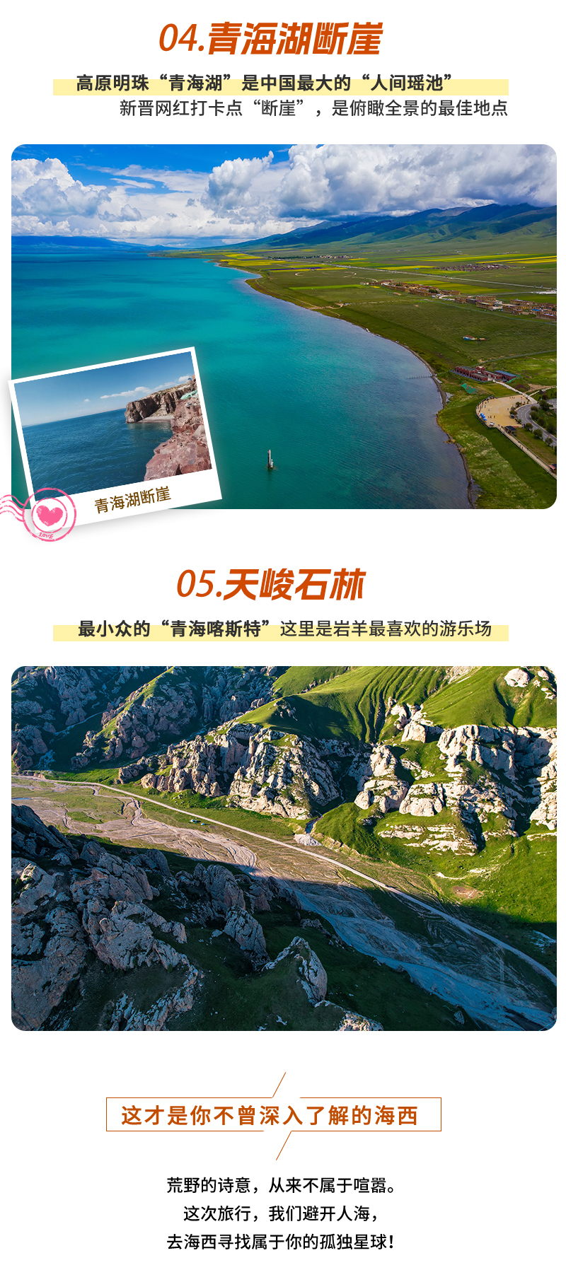 如果你也觉得旅行应是对未知的探索,对心灵的洗礼,而不是在扎堆的旅行团和小贩的叫卖声中草草拍几张打卡照,那么【青海湖断崖】会给本次旅程开一个好头。作为新开发的景点,这里只有惊涛拍岸和飞鸟蹁跹,观景台可以把青海湖的辽阔尽收眼底,走在临海栈道上,潮湿而清冽的风迎面扑来,湖水在脚下翻涌而过,十分舒适。在这里拍照不需要挑角度,随手就是大片。