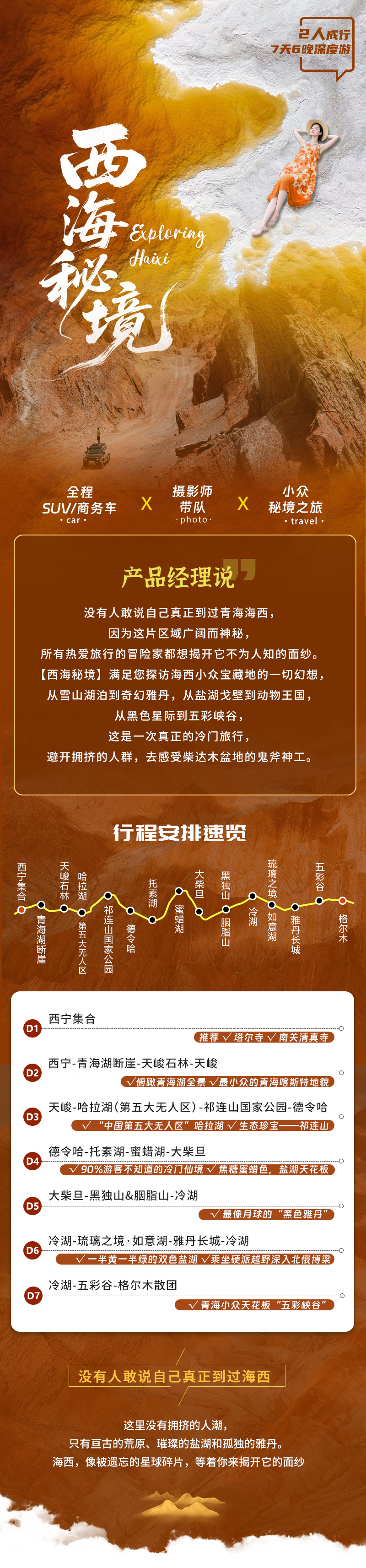 注: 1、大柴旦镇海拔约3200m; 2、行程处于柴达木无人区,建议提前准备零食和水果; 3、进入蜜蜡湖将换乘硬派越野车。
