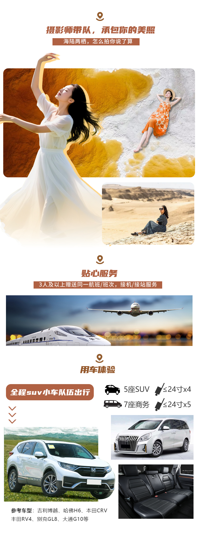 【交通】全程5座SUV或7座商务车包车费用;含司机吃住、油费、过路费; (5座SUV坐4人+1司机,7座商务坐5人+1司机),商务车不支持指定,根据最终人数安排;