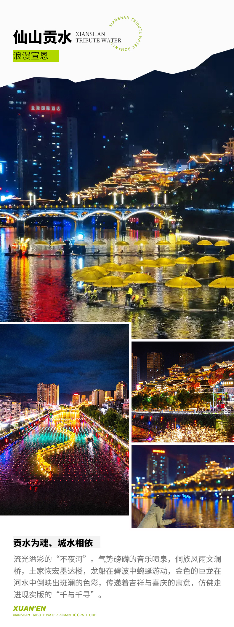 D6:沐抚 - 恩施大峡谷 - 住宣恩全天 早上前往【恩施大峡谷】景区,峡谷内遍布绝壁悬崖,流水飞瀑,千仞孤峰,壮观地缝,原始森林,乡村梯田,迎客松、一炷香、情侣峰、绝壁长廊、大地山川、母子情深,步步为景,美不胜收。 我们将先前往【七星寨】(游览约4小时),漫步在神奇的喀斯特地貌,随着海拔的升高,眼前美景不断变化,大自然的鬼斧神工令人赞叹。从大峡谷出来后,再游玩地球“最美伤疤”【云龙地缝】。 晚上入住宣恩市区酒店。在宣恩这个浪漫小城,一河两岸,灯光璀璨,半城烟火半城仙。国内最长的音乐跑泉在此欢快跳跃,宛如仙女的丝带在空中舞动。 晚上去体验特色宣恩烤活鱼,再漫步贡水河畔,走上风雨文澜桥,感受恩施小洪崖洞浪漫夜景。