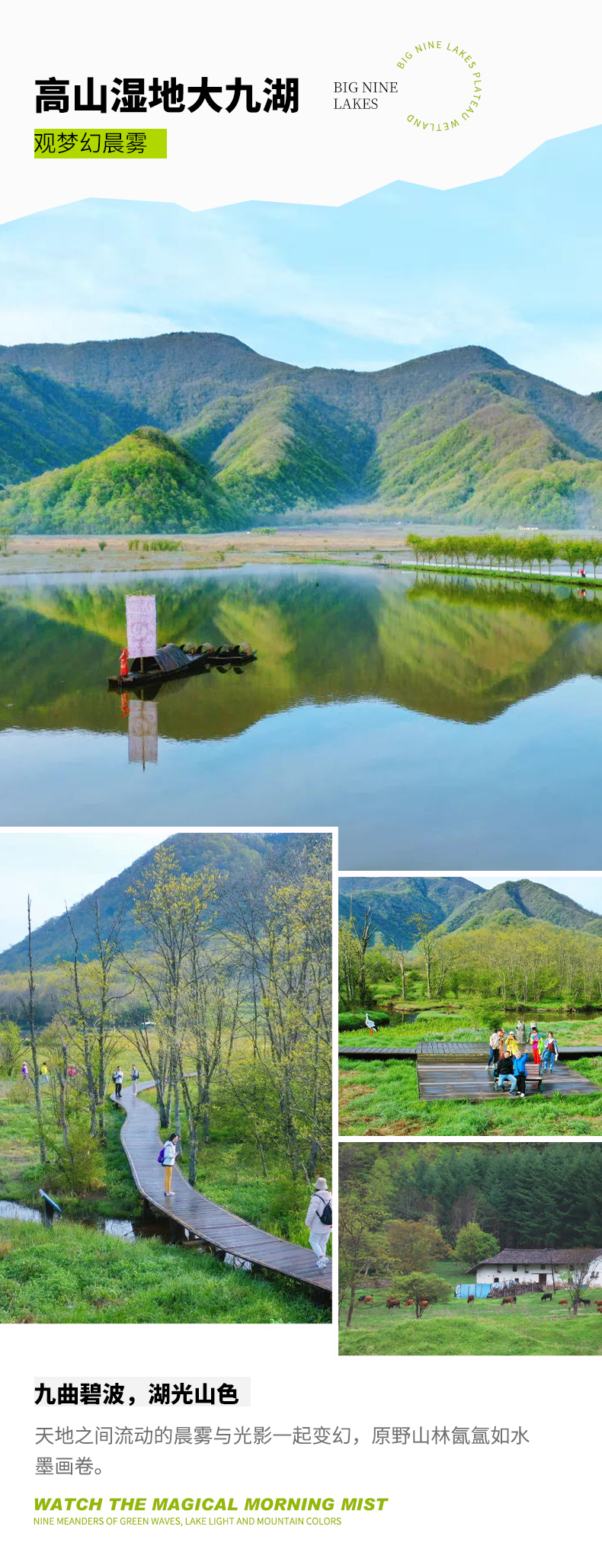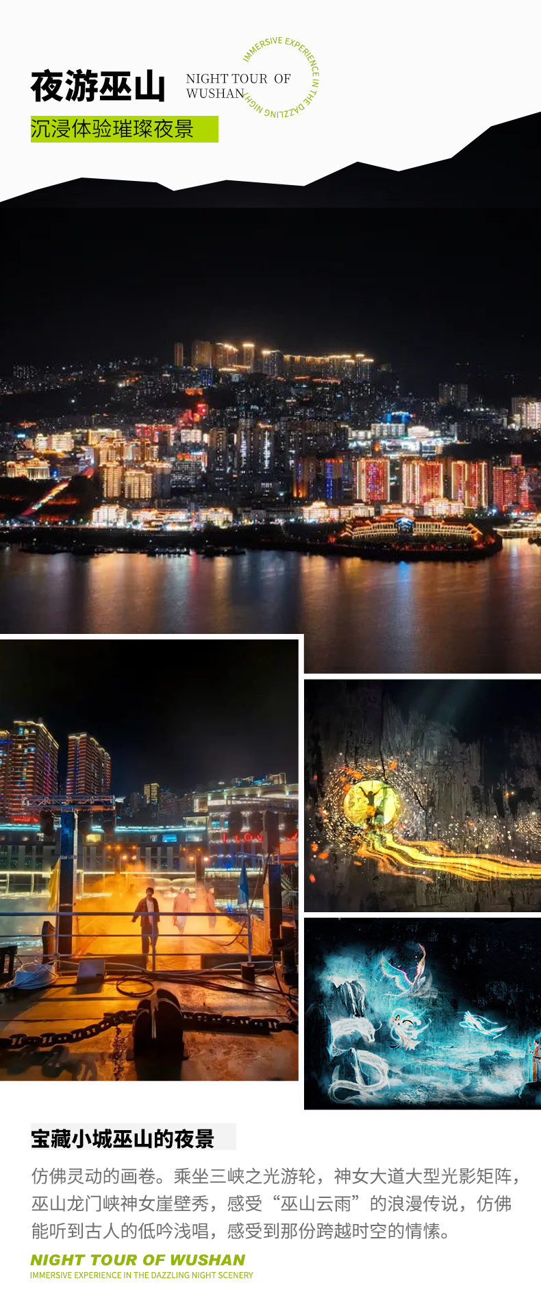D3:坪阡古镇 - 大九湖 - 巫山夜游船 - 住巫山全天 今日早起前往【大九湖】大九湖被称作是华中的呼伦贝尔,藏在深山中的一片高山草甸,弯曲的溪流在九座山梁间汇集成了大大小小的九个湖泊。 - 步行在木栈道上,看两侧的风景,弯弯溪流在九座山梁间汇集而形成了大大小小九个湖泊,每个湖泊都有各自的特色。行走在湖间栈道,沐浴着阳光,有如世外桃源。旖旎的风光真可谓是“应是水墨画中景,沧海遗珠落人间”。 大九湖内还有鹿苑,这里可以欣赏到可爱的梅花鹿。 下午驱车前往【巫山】 “曾经沧海难为水,除却巫山不是云。”地处三峡腹心的巫山,自然风光瑰丽无比,历史文化悠久灿烂。作为“渝东门户”,巫山与相邻的奉节、巫溪构成的长江三峡旅游“金三角”,是众多国内外游客游览三峡的首选之地。我们将在巫山长江大桥旁观景台,欣赏巫山山水相依的绝美景观。 晚上可以尝尝地道的巫山烤全鱼,看看巫山这座山城夜景。 晚餐后,乘坐三峡之光游船游览【巫山夜景】 三峡之光,是巫山旅发集团联合国内顶级夜游创制团队打造的大型长江文化情境夜游,以巫山文化、三峡文化和长江文化为核心,以现代科技的光影手法为笔墨,借千年崖壁为画卷,携长江水为画笔,为巫山量身定制的“山水美景伴左右,文化大赏通天地”情境夜游,是长江流域独一无二的夜游新地标。 船游过程中包含:非遗民俗文化歌舞互动表演;神女大道大型光影矩阵;南陵春晓诗词演绎;巫山龙门峡神女崖壁秀。