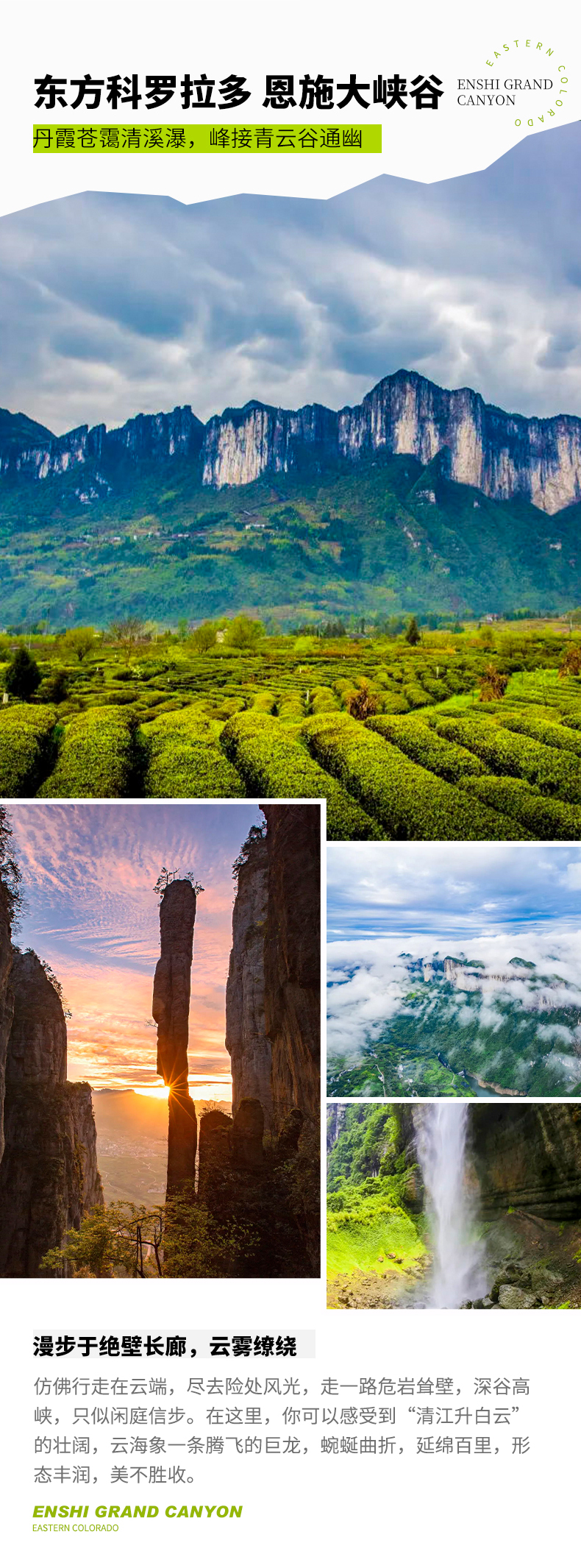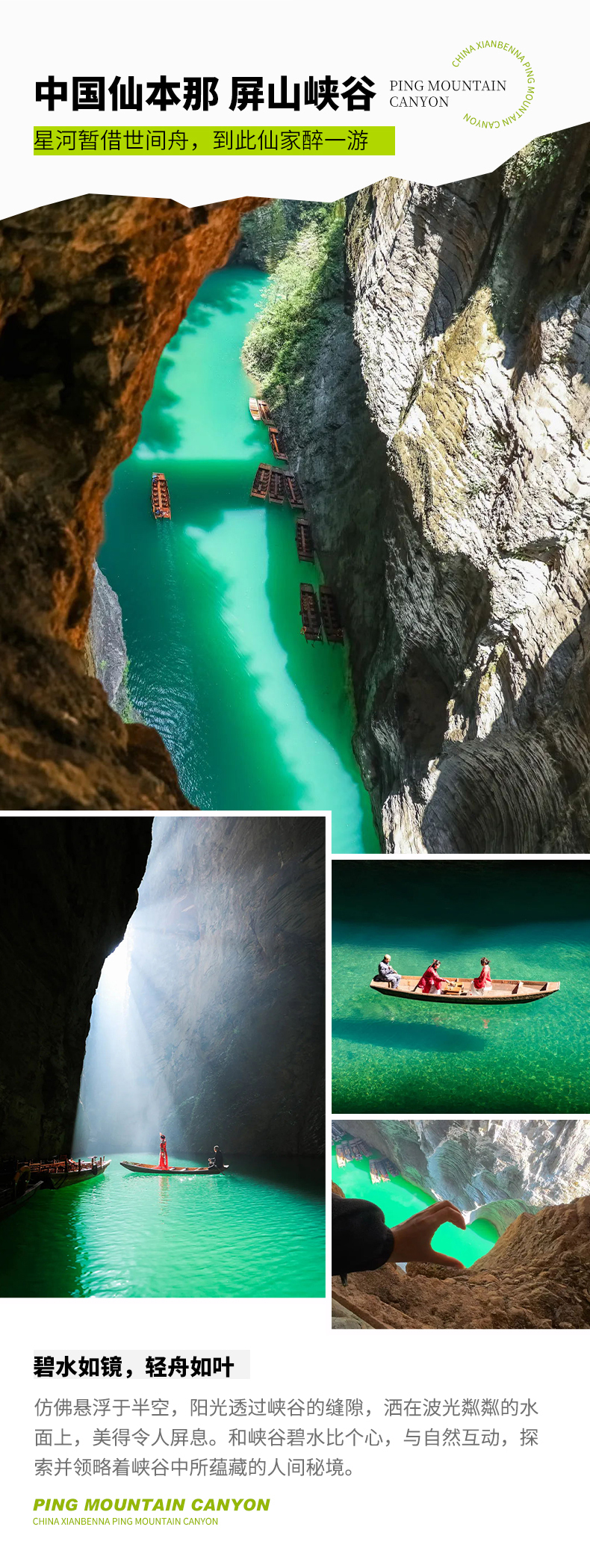 D7:宣恩--屏山峡谷--恩施送站/机全天 上午奔赴 4A 级景区,这片被誉为“东方仙本那”的奇境,形成于第四纪冰川时期,集奇、秀、险于一身。沿步道下行至峡谷河畔,移步换景间尽览自然野趣。百余丈深的峡谷里,溪水碧蓝澄澈,通透见底。 晴日里,阳光折射水面,泛舟其上如凌空悬浮,仙气飘飘;雨天时,谷内温差催生薄雾,云雾缭绕间,宛若闯入缥缈仙境。 尽兴游玩后,乘大船顺峡谷穿行返程,沿途风光依旧惊艳,千万别眨眼,错过每一处心动瞬间! 下午我们将乘车返回恩施,司导会把队员送到恩施许家坪机场或恩施站。至此,本期的巴楚之旅告一段落,大家可以带着一路的美好记忆,奔赴家中的烟火与安宁。