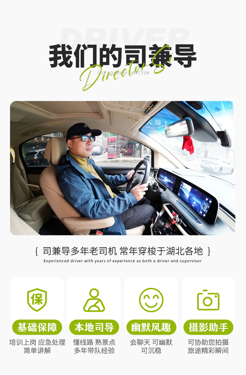 湖北优秀司机兼管家全程服务,负责开车、讲解行程玩法、协助办理票务和酒店入住、景区不陪同进入,请理解;