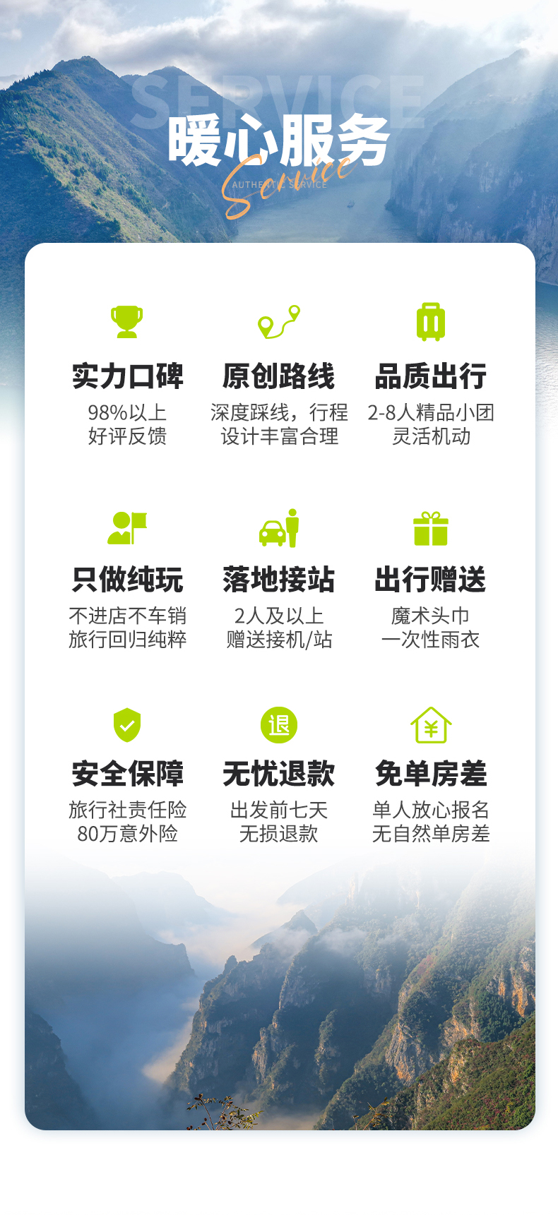 注:接机/站请提前2天告知航班号/车次,否则视为放弃此服务;赠送项目如客人自愿放弃或因特殊原因及不可抗力等原因无法参加,均不退费用,也不等价交换。