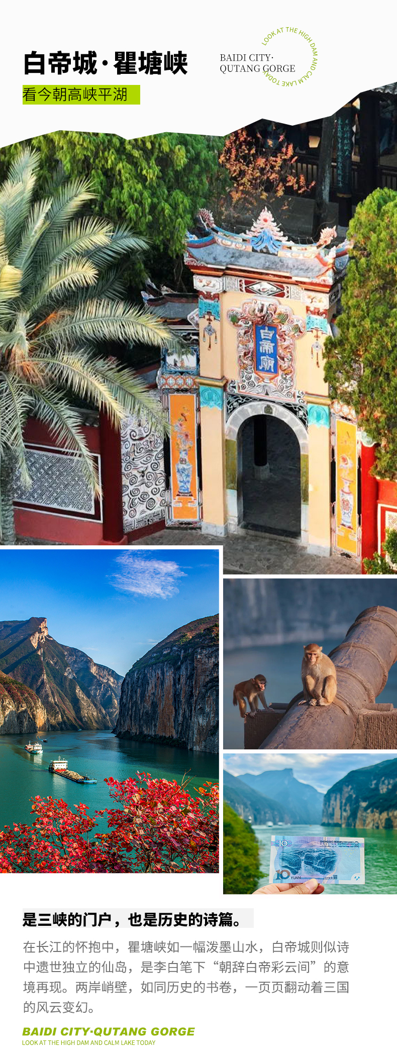 D4:巫山 - 三峡之巅 - 白帝城 - 住奉节全天 上午前往【三峡之巅】三峡之巅因杜甫“赤甲白盐俱刺天,闾阎缭绕接山巅”的诗句而得名,有夔鼓神坛、四望乐坛、音祖雕像、夔字门、竹律雅欄、迎龙台等景点。这里是三峡的制高点,我们将在这里俯瞰瞿塘峡全景,观长江的壮美,以及群山的拥簇。 下午前往【白帝城·瞿塘峡】以“朝辞白帝彩云间,千里江陵一日还”的诗句而闻名于世的白帝城,位于重庆市奉节县城城东十里的白帝山上。 我们将深入山间小路,拍摄瞿塘峡风光,如果你还能找到一张第五版10元人民币,别忘记带上,看看【夔门】过去和现在的变化,三峡大坝蓄水至海拔175米后,瞿塘峡已是高峡平湖,两岸险峰峻石依旧,既有满山红叶似彩霞的绚丽多姿,又有碧水荡漾、烟波浩渺的静美壮阔。 晚上入住奉节酒店。