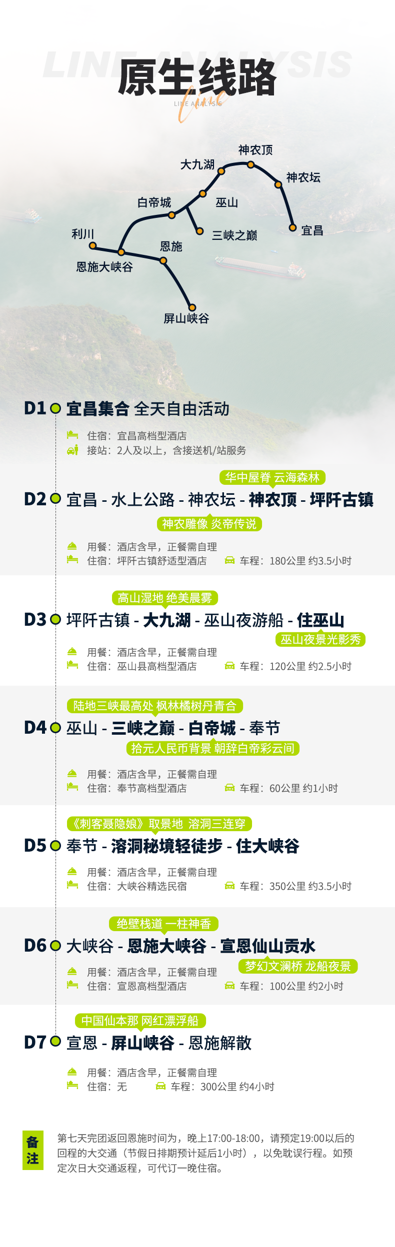 注1: 行程结束当天预计18:00左右到达恩施解散,建议返程时间:高铁18:30、航班19:00