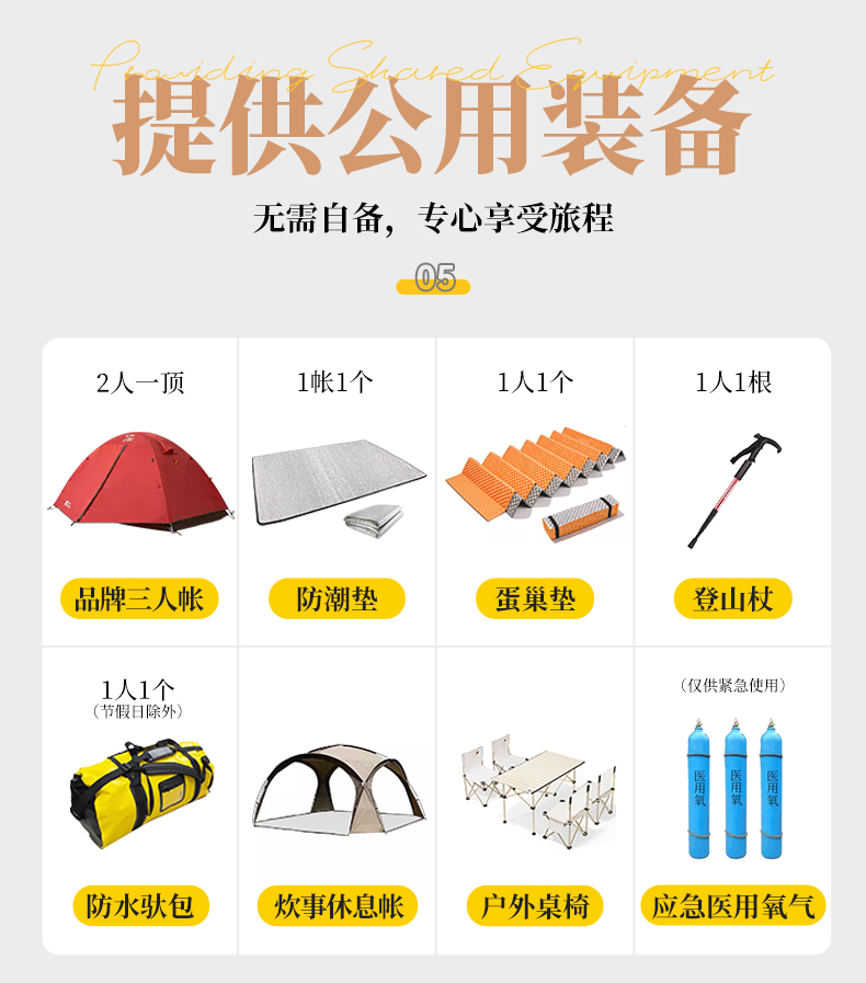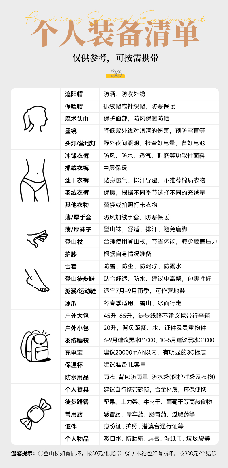 遮阳帽、保暖帽、魔术头巾、墨镜、头灯/营地灯、冲锋衣裤、抓绒衣裤、速干衣裤、羽绒衣裤、其他衣物、薄/厚手套、薄/厚袜、子、登山杖、护膝、雪套、登山徒步鞋、溯溪/运动鞋、冰爪、户外大包45升-65升、户外小包、羽绒睡袋、充电宝、保温杯、雨衣、背包防雨罩、防水袋、个人餐具、徒步路餐、常用药、身份证