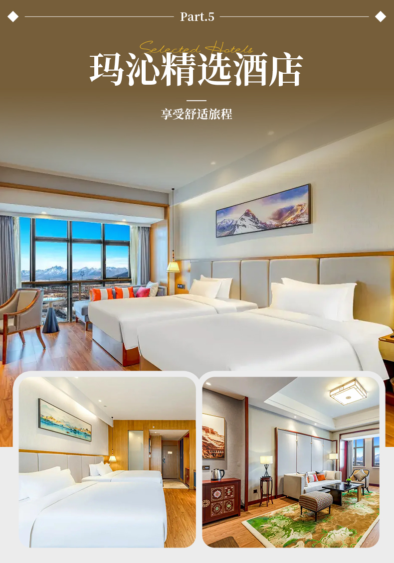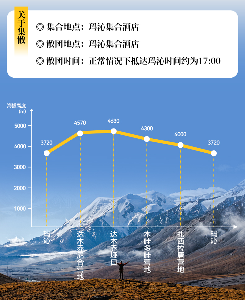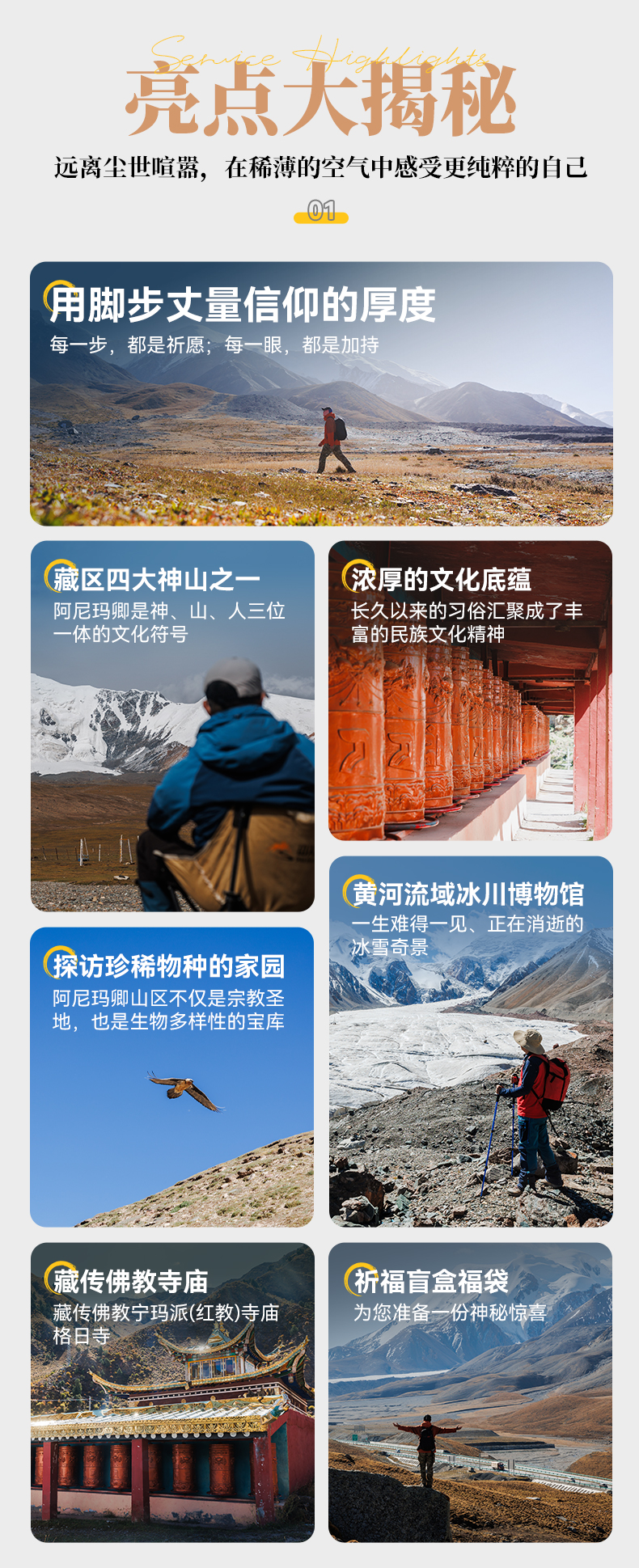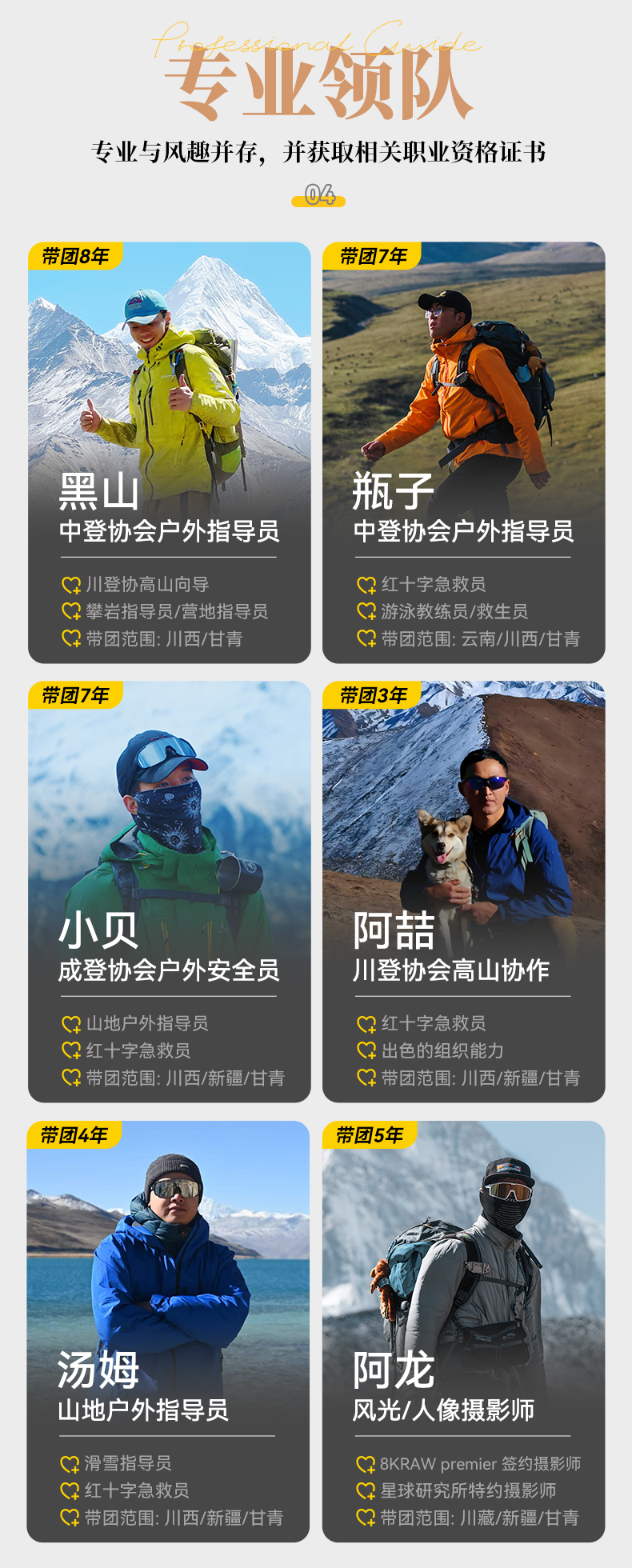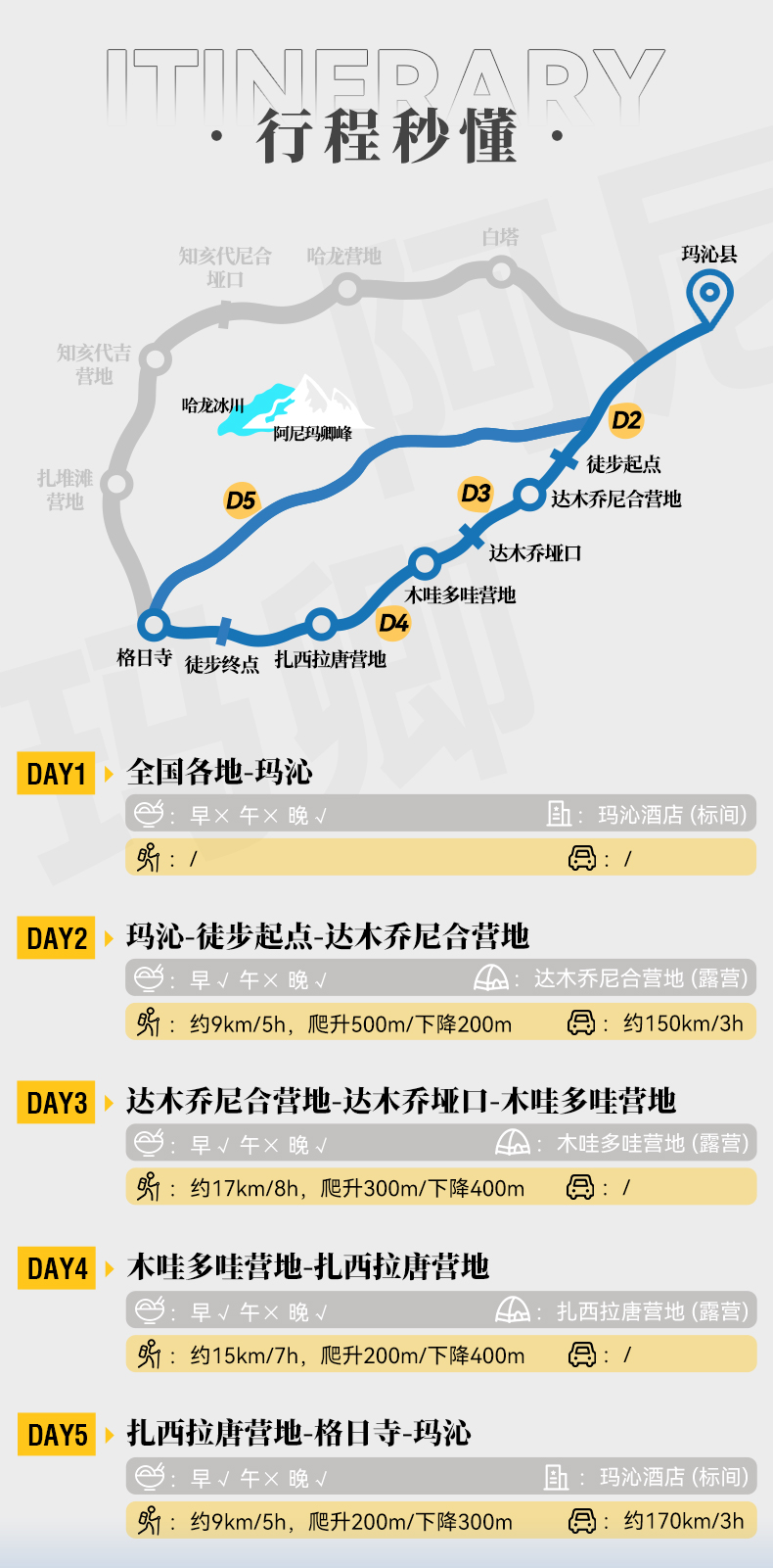 D5:扎西拉唐营地 - 格日寺 - 玛沁全天 正常出发时间为早上8:00点-8:30,清晨告别营地,沿公路徒步约9公里,途经一处经幡飞舞的垭口,然后到达我们本次行程的终点,随后乘车前往格日寺参观和冰川,最后乘车返回玛沁,庆祝行程圆满。正常情况下抵达玛沁时间约为17:00。