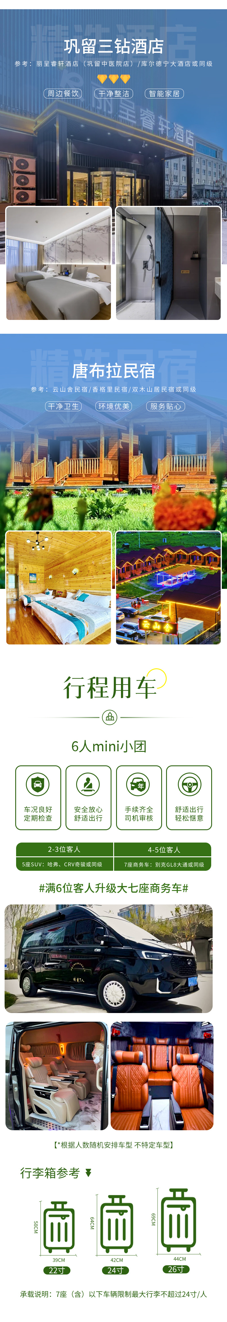 3、用车:2-3位客人用五座SUV,4-5位客人用七座商务车,6位客人升级大七座商务车(小团副驾驶及前后座位置需要轮流乘坐,望悉知);