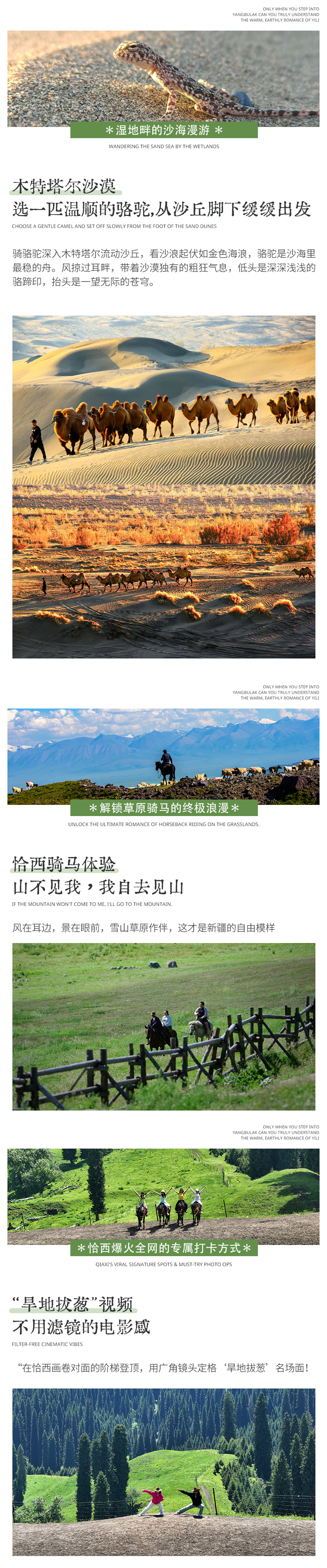 D2:乌鲁木齐-(250公里,约3小时)安集海大峡谷-木特塔尔沙漠/骆驼骑行(180公里,约3小时)-精河(80公里,约1.5小时)全天 09:00 起床,吃过早餐后出发,正式开启梦幻新疆之旅,出发前往伊犁地区。 12:30 抵达【安集海大峡谷】。在天山山脉,通过长年冲刷,在通古特附近冲出天山峡谷,在天山北坡下形成了规模宏大的冲积扇,河谷冲积扇规模宏大,以伞形向北张开,堪称地质奇观。站在山顶往谷底看,十分震撼。 16:30抵达【木特塔尔沙漠】,绵起伏的金色沙丘,在阳光下呈现出从浅金到焦糖的丰富层次;风过沙鸣,流动的沙脊线勾勒出大自然的鬼斧神工。你可以选温顺的【骆驼骑行】,在黄昏的暖光里缓步穿行沙海,看长长的影子随沙丘起伏。 18:30 抵达精河办理入住,大家自己寻找美食。