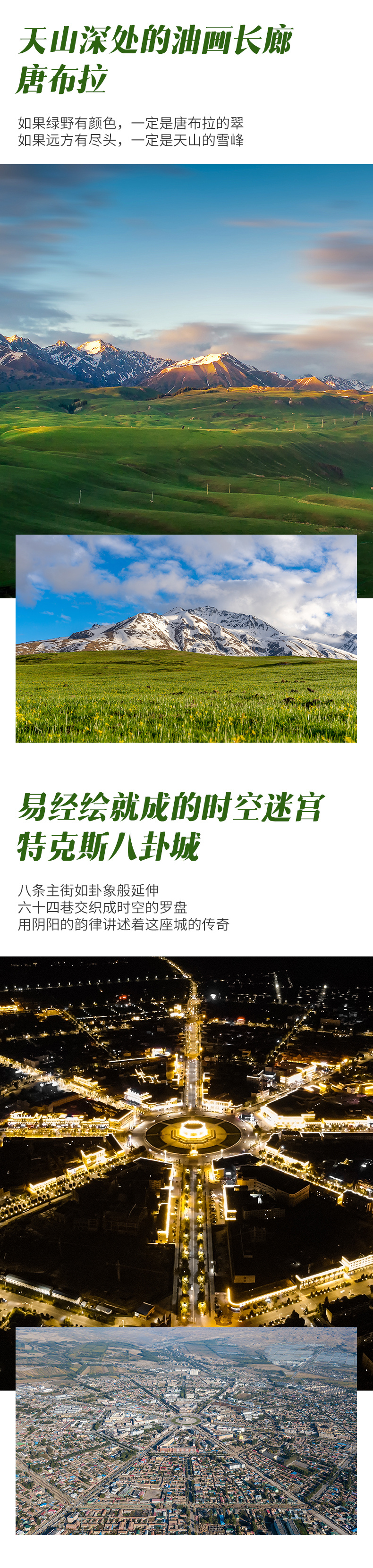 D8:唐布拉百里画廊-独库公路(200公里,约4小时)-乌鲁木齐解散(240公里,约2.5小时)全天 07:00今天不能睡懒觉了,早餐后出发独库公路。每到旺季独库公路都非常拥挤,为了能赶在预定时间返回到乌市,需要早早的出发。 08:00首先到达的是唐布拉【百里画廊】,这里山峦连绵起伏,恰似大地凝固的波涛,线条优美而雄浑。山坡上,墨绿的云杉林如忠诚的卫士,整齐排列,守卫着这片神奇的土地。 09:30【独库公路】(开放时间:6月中旬,以实际时间为准。如未开放绕行218公路返回乌鲁木齐大约10小时车程)“一天有四季,十里不同天”,各种绝美景色毫无保留的铺展在你的面前,未经人工雕琢,原始而又震撼。 被《国家地理》评选为“纵贯脊梁的景观大道”。堪称最美公路!我们会途径“天瀑”、乔尔玛烈士陵园等景点。 20:00抵达乌鲁木齐机场/火车站,今天我们此次活动就接近尾声了,我们就要相互拥抱告别了。期待下次有你的旅行,此次行程圆满结束