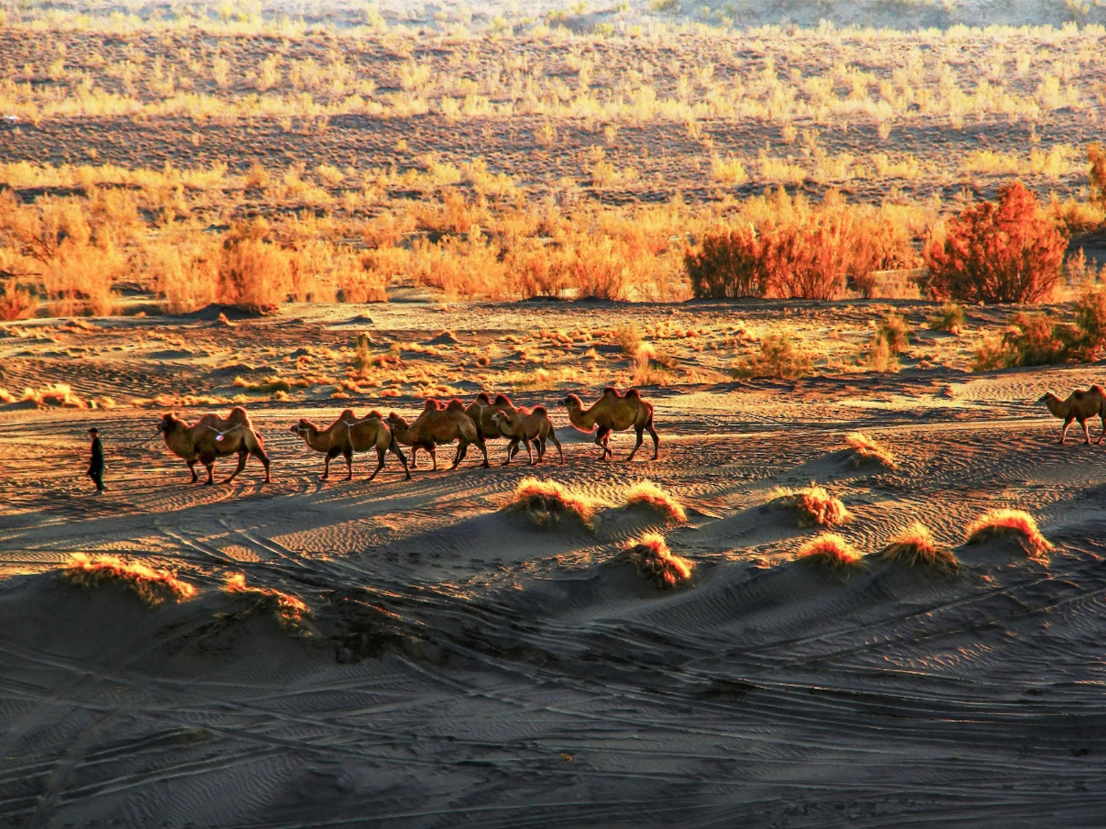 16:30抵达【木特塔尔沙漠】,绵起伏的金色沙丘,在阳光下呈现出从浅金到焦糖的丰富层次;风过沙鸣,流动的沙脊线勾勒出大自然的鬼斧神工。你可以选温顺的【骆驼骑行】,在黄昏的暖光里缓步穿行沙海,看长长的影子随沙丘起伏。