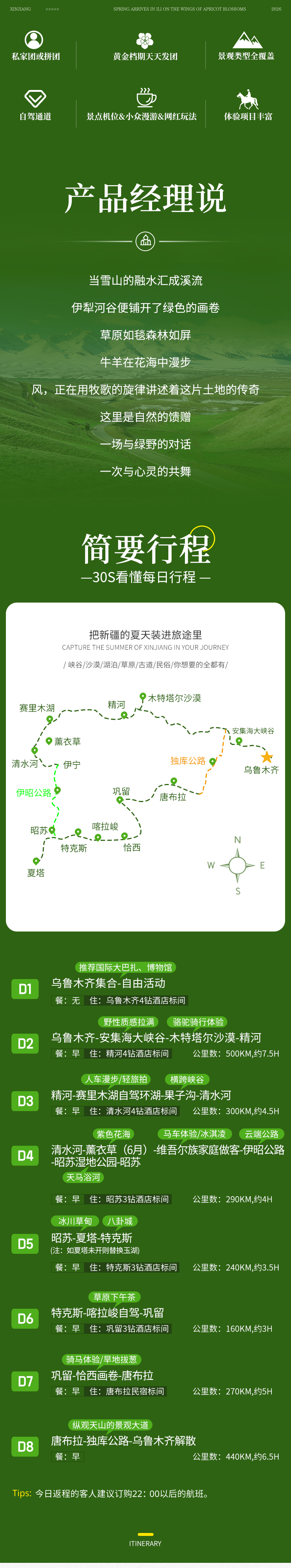 注1: 1. 独库公路地势险峻,每年6月开通。24年开通时间为6月1日,开通以后有可能会因为天气原因封路,如果封路无法通行就走218公路绕行返回乌鲁木齐约10小时车程。 2.今日返程的客人建议订购22:00以后的航班。