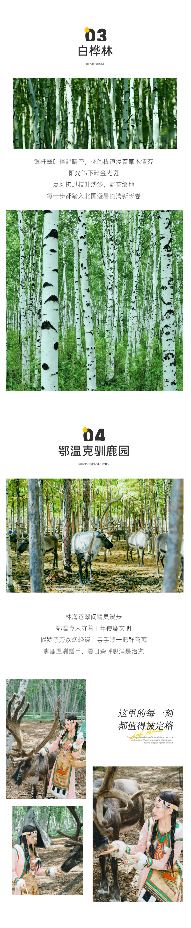 11:00 随后前往【鄂温克驯鹿园】,走进大兴安岭的密林深处,温顺的驯鹿顶着硕大的鹿角在林间漫步,眼神温柔澄澈。夏季的驯鹿活跃度极高,可自行购买苔藓喂食它们,感受它们进食时的“点头礼”,与这些灵动的生灵亲密互动、拍照合影。