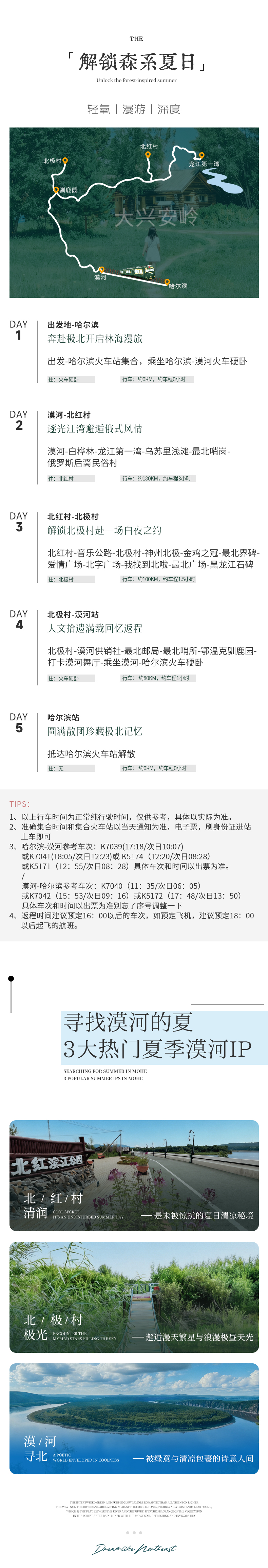 D4:北极村-漠河供销社-最北邮局-最北哨所-鄂温克驯鹿园-打卡漠河舞厅-乘坐漠河-哈尔滨火车硬卧(80KM,车程约1小时)全天 08:00 早餐比较简单,馒头咸菜粥。 08:30 清晨的北极村静谧清新,在村落中漫步,看木屋炊烟袅袅,感受最北村庄的烟火气息。随后前往【漠河供销社】,复古的货架上摆满各种货品,泛黄的海报与旧时光摆件让人瞬间穿越。 10:00 打卡【最北邮局】,这座中国最北端的邮局充满仪式感,挑选一张心仪的明信片,写下旅途的感悟与祝福,盖上专属的“最北邮局”邮戳,让这份来自极北的心意跨越山海,传递给亲友。途经【最北哨所】,哨兵们用青春守护祖国北大门的责任与担当令人动容,不妨致以敬意,定格这庄严的一幕。 11:00 随后前往【鄂温克驯鹿园】,走进大兴安岭的密林深处,温顺的驯鹿顶着硕大的鹿角在林间漫步,眼神温柔澄澈。夏季的驯鹿活跃度极高,可自行购买苔藓喂食它们,感受它们进食时的“点头礼”,与这些灵动的生灵亲密互动、拍照合影。 14:00打卡【漠河舞厅】,这座因歌声走红的舞厅藏着漠河的岁月沉淀。走进其中,复古灯光与悠扬老歌交织,仿佛穿越回上世纪八十年代,夏日的慵懒与怀旧氛围相融,不妨在此静坐片刻,感受这份跨越时光的温柔,打卡同款场景,留存独特记忆。 15:00抵达漠河火车站,乘火车硬卧赴哈尔滨,火车条件有限,敬请谅解,参考车次K7040(11:35/次日06:05)或K7042(15:53/次日09:16)或K5172(17:48/次日13:50)。