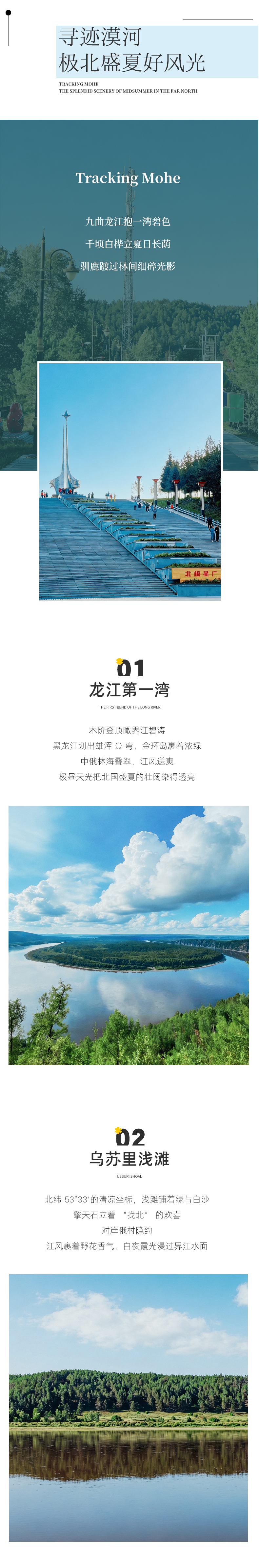 漠河-白桦林-龙江第一湾-乌苏里浅滩(140KM,车程约2小时)-最北哨岗-俄罗斯后裔民俗村 (40KM,车程约1小时)