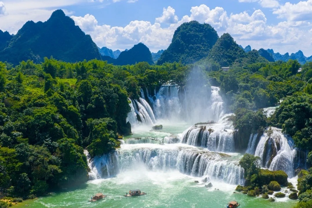 11:00 来到【德天跨国瀑布】,当轰鸣的水声隐隐传来,你知道,亚洲第一大跨国瀑布的磅礴剧幕即将揭开。穿过“德天牌坊”,迎面而来的归春河便是中越的界河。破开碧绿的水面直抵瀑下。巨大的水帘从60余米高处三级跌落,飞溅的水雾瞬间包裹全身,左手边是气势恢宏的德天瀑布,右手边则是越南的板约瀑布,它们宛如一对亲密的姐妹。此情此景,远比任何影视剧中的画面更为震撼。