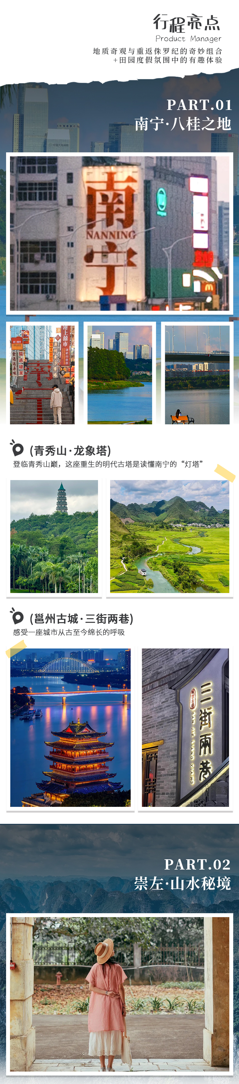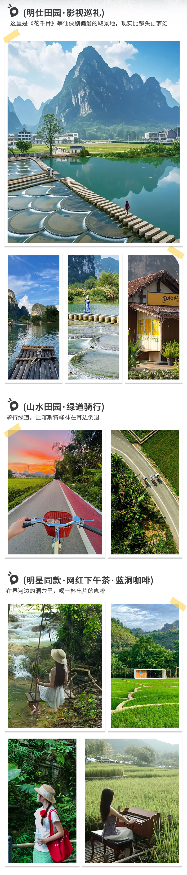 D3:明仕田园-峒那屿湾-明仕田园-竹筏游江-鱼鳞坝-绿道自行车漫游,住大新(约40KM,车程约1.5小时)全天 08:00 酒店用早餐后出发。 09:00 穿行在【峒那屿湾】,当黑水河碧绿的河道在眼前展开,你便抵达了素有“别样漓江”之称的秘境。我们选择“水路通票”,先乘【画舫】泛舟水上。船行如滑入“水上幻境”,两岸峰林倒映,颇有穿越至《花千骨》仙侠世界之感。别忘了登岸探索龙碧滩叠瀑和充满壮乡风情的瀑上圩场,用2个小时的时间,完成一场山水与人文的交织对话。 12:00 驶出山水画卷,在乡村街巷中,探索不一样的广西美食。 13:30 回到明仕田园开始【竹筏游江】,将你的午后时光交给明仕河的柔波。登上一叶竹筏,船工的长篙一点,你便滑入了这幅喀斯特地貌的山水长卷。河水碧绿,倒映着两岸无数秀美的峰林。传说中“万乳崖”的奇观和“神猴拜观音”的山形故事在船工的指点下变得生动。如果运气好,或许还能听到竹林深处传来壮族姑娘清亮的迎客山歌,为这场“画中游”平添一份在地的趣味,是沉浸式感受明仕田园灵魂的最佳方式。 15:00 竹筏靠岸,步行片刻便能遇见这片田园里的网红“浪花”。【鱼鳞坝】并非自然造物,却与山水和谐相融。层层叠叠的坝体将河水切割成一片片晶莹的“鱼鳞”,水流漫过时发出清脆悦耳的声响。这里是摄影的黄金机位,你可以走上坝体,以奔流的水幕和远处青翠的峰林为背景,拍下一张充满动感的旅途大片。夏季这里也是亲水乐园,不少游客会在此嬉水,感受一份清凉 16:00 是时候换一种节奏,开启【绿道骑行】,成为一名田野间的追风者了。沿着平坦的田间小道,穿梭在稻浪、甘蔗林与错落的村舍之间。骑行没有固定终点,最美的风景常在不期而遇的转角:可能是田边吃草的水牛,也可能是掠过天空的白鹭。夕阳西下时,柔和的金光洒满田园,正是骑行最惬意的时刻。 18:00 傍晚时分,返回酒店。