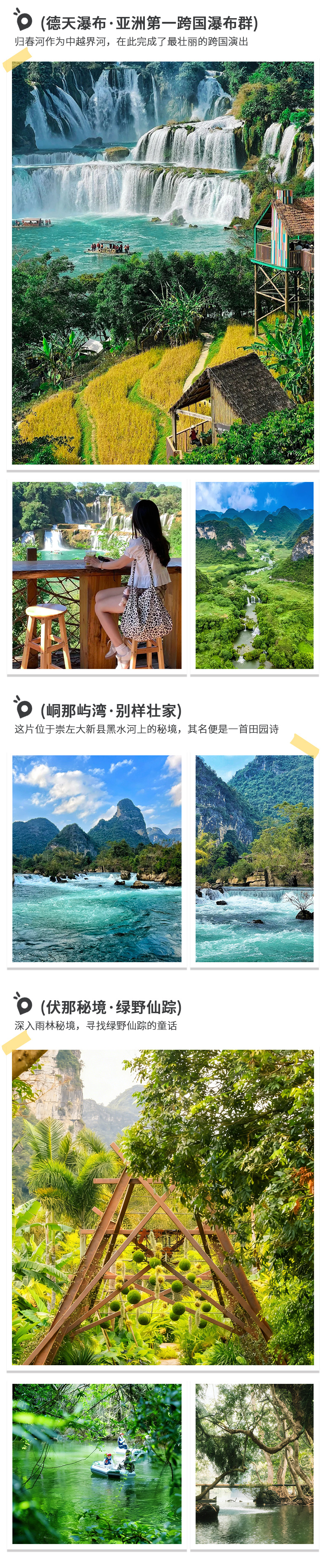 4、门票:德天瀑布(含景交车)、伏那秘境(陆游门票含观光车)、峒那屿湾(水陆联票)、明仕田园(竹筏票);