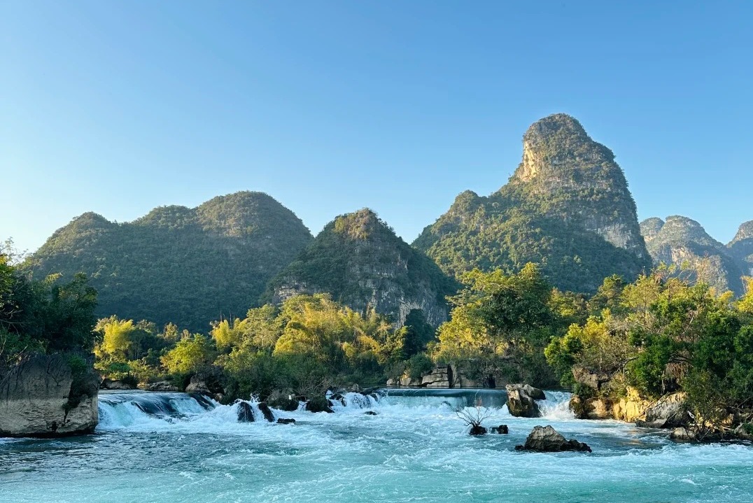 09:00 穿行在【峒那屿湾】,当黑水河碧绿的河道在眼前展开,你便抵达了素有“别样漓江”之称的秘境。我们选择“水路通票”,先乘【画舫】泛舟水上。船行如滑入“水上幻境”,两岸峰林倒映,颇有穿越至《花千骨》仙侠世界之感。别忘了登岸探索龙碧滩叠瀑和充满壮乡风情的瀑上圩场,用2个小时的时间,完成一场山水与人文的交织对话。