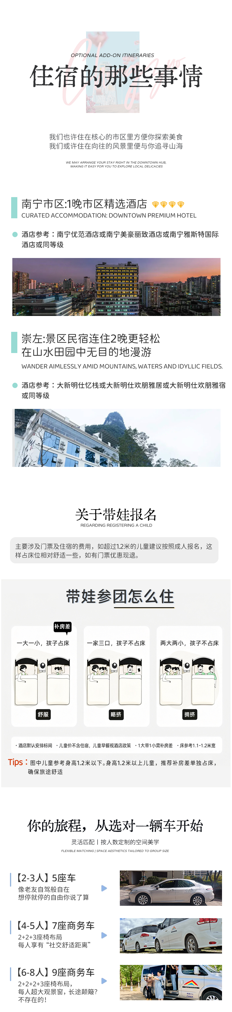 1、住宿:南宁1晚四钻酒店(参考优范酒店UFUN(南宁朝阳广场建政路店)或同等级)、明仕田园2晚酒店/民宿(参考大新明仕忆栈或大新明仕欢朋雅居或大新明仕欢朋雅宿或同等级酒店/民宿);