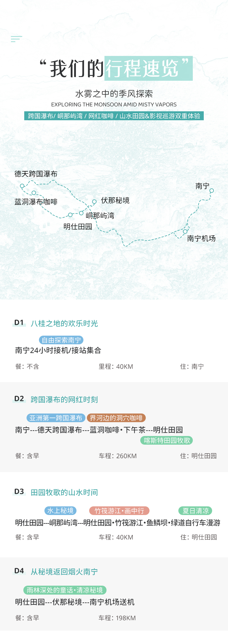 明仕田园-伏那秘境-南宁机场(约200KM,车程约3.5小时)
