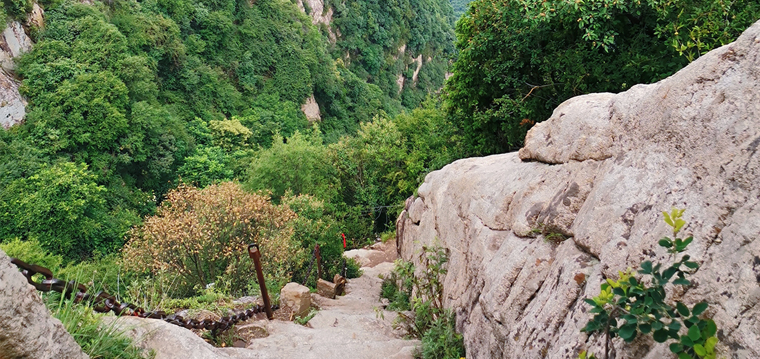 嘉午台由五座山峰组成,其中心最高峰岱顶,海拔1870米,山险景胜。登览嘉午台,必经之地“小梯子”长十余米,数十级石阶凿在悬崖上,崖壁上有铁索链,游人须攀索拾级而上;其最险处是“大梯子”,悬崖峭壁迎面拔起,在光滑的陡壁上人工凿出了一条40米长的石阶,石阶旁悬有明万历十一年铸造的铁索。
