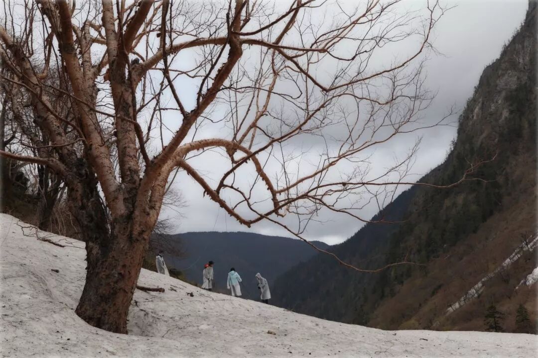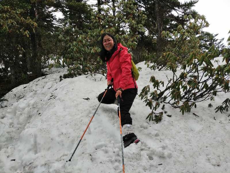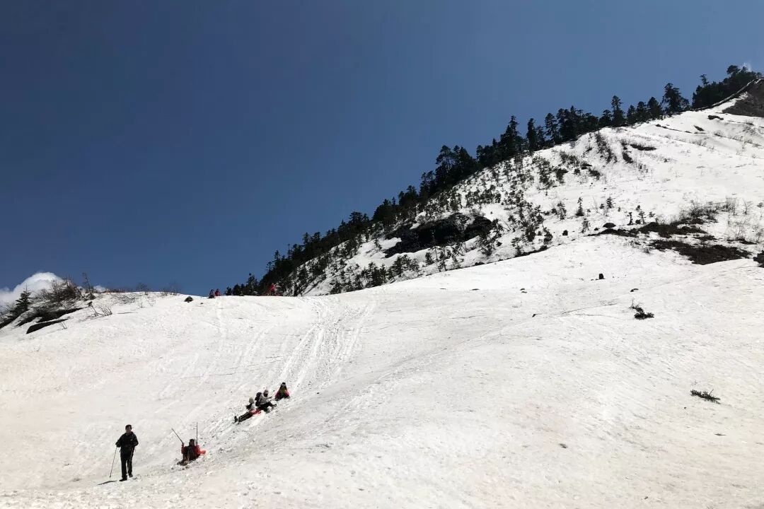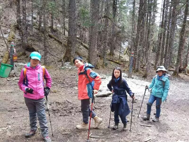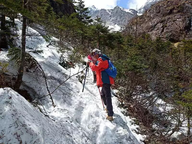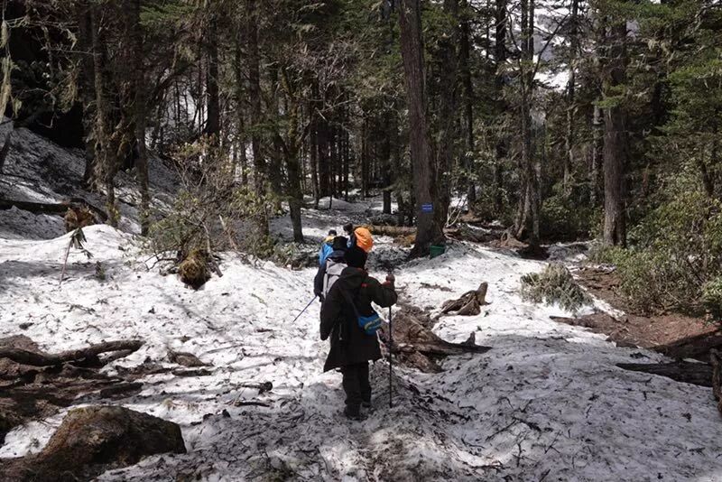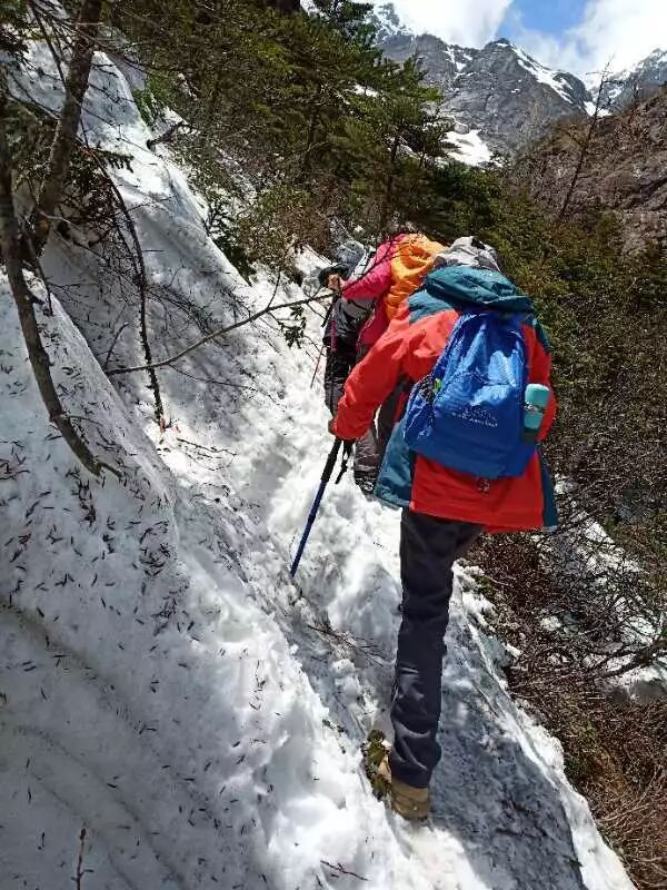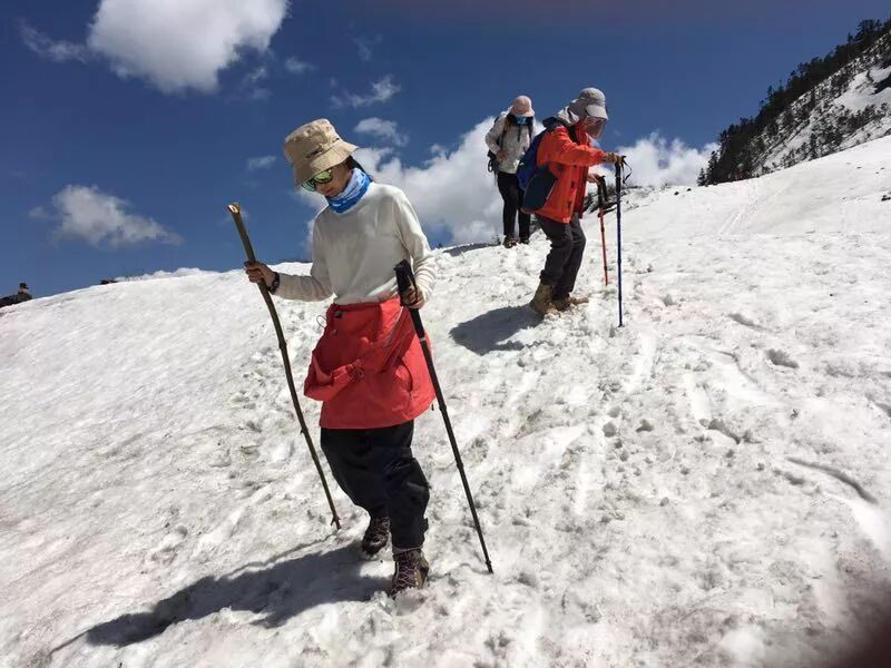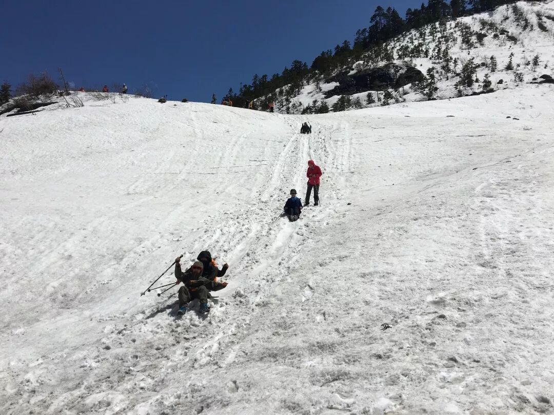 可是上山容易下山难。若是前几日,一提到下山,我的腿就开始不听使唤。没办法,自己曾在婆婆家门口的小土坡上摔断过骨头,扭伤过脚,就此留下了心理阴影。所以,一提到下山,就不由得紧张起来。但不知是因为锻炼了两天,还是我的这双登山鞋给力,还是因为地面的不同,这次就没有滑倒过。当然如果是在雪地上则另当别论。如果在雪坡上还要保持自己屹然挺立则有些不合时宜,何不因势利导,一路滑下去。于是我们几个雪山小白沿着雪坡呲溜呲溜滑得不亦乐乎。虽然落地的样子像各种动物,但却充满欢乐,当然要谨防一失足成千古恨。还有就是某某同学每下降几米,就开始脱鞋、除雪;还有就是溪之小朋友的袜子能挤出黑黑的雪水来,还好,没有伴随浓浓的气味。