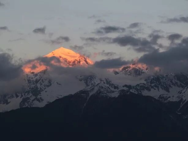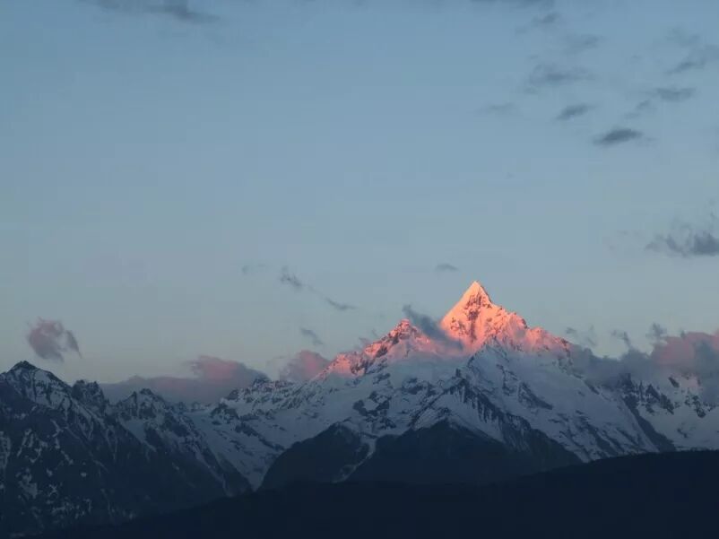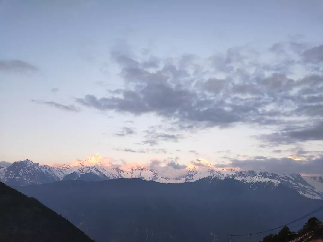 按着团长指示,今天一早是要看日出的,这才明白落脚飞来寺的用意。登上酒店楼顶,对着远处的雪山,等着那一轮红日。半天没一点动静。希同学用观星软件测了下,雪山那里是西方,什么鬼,太阳从西边出来?旁边看不下去的游人忍不住提醒,这不是观日出,是观日照金山。汗。没做攻略的人真心无知。当远处的雪山尖顶开始被金光笼罩时,观众有些躁动了。然后被提醒,看到此景的都是幸运之人,很多人来几次都看不到。