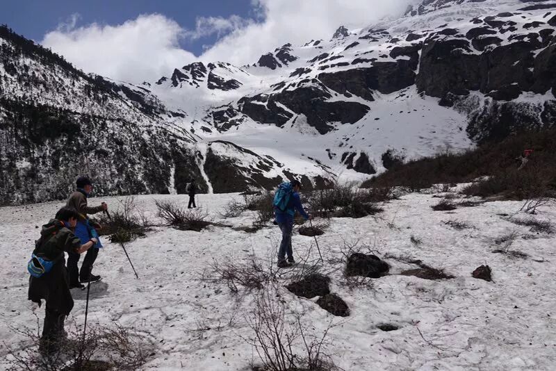 当然登上垭口看到雪山清晰壮观地呈现在眼前时,还是很震撼的。继续前行。是一段极难走的下坡雪路。每一步都要试探仔细,我觉得我随时都有脚底打滑,骨碌滚下去的危险。嗯,对,就是危险。我觉得第一次跟危险这样近距离接触。