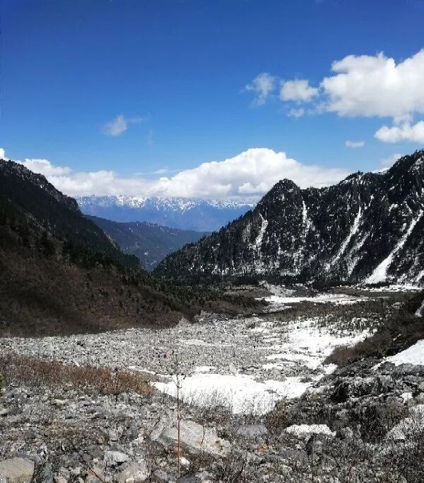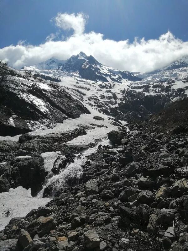中午抵达大本营,领队用带的炉子烧了热水给我们补给。简单休息过后,领队一起身,示意我们跟上。有点犹疑,毕竟我觉得我已经足够近的接近雪山了。带走犹疑的是领队那句,走吧,还有1.5公里,不去可惜。1.5公里,真的不算长啊,斟酌了很久,我决定跟上。