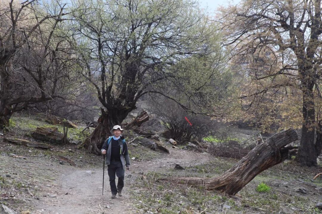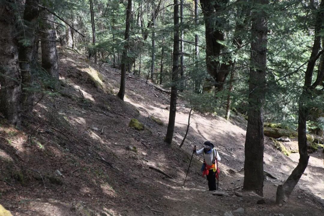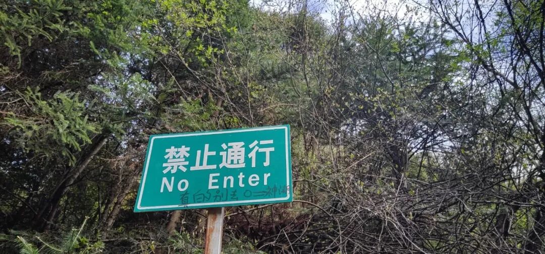 如果说前两日是徒步,那这一天则是名副其实的爬山,两者的区别大家自行脑补。山上没有大路,有的只是前人踏出的土路,且如羊肠一般。有趣的是,没走多久就见一块告示牌,上书四个大字“禁止通行”,更奇葩的是下面歪歪扭扭地写着这样一行小字—“真的别去神湖”。难道神湖真如传说中所说的那样遥不可及?不妨让俺老孙去探个究竟!