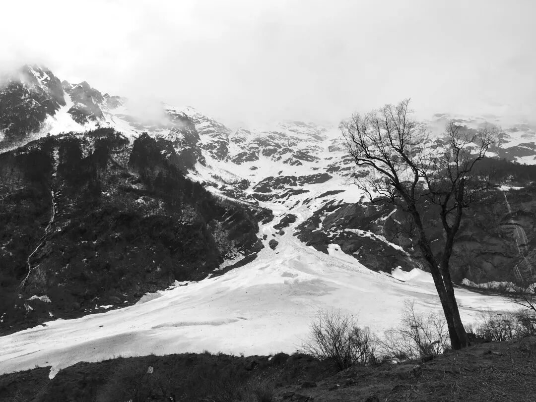 领队没有任何预兆地领我们上山,我们也就稀里糊涂地跟着上了雪坡,小山坡,等慢慢意识到好像有点不对劲时,才回过神来,我们即将要挑战一座坡度在75度左右的山坡,并且,再次延续开弓没有回头箭的尬。只能上,没法下。生平第一次真切感受到随时会滚下山挂掉的恐惧。某娃直接哭了。